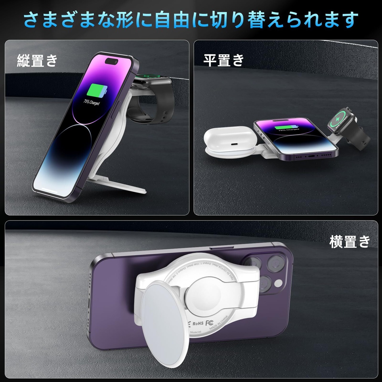【最新3in1magsafe充電器】A6は最新の3in1magsafe充電器です、特有の急速Apple Watch充電機能を搭載しております、充電速度を30%向上させます、最短2時間にフル充電が可能です。同時にスマホ、AirPods、iWatchを充電できます、乱れた生活にわかれをつげます。
