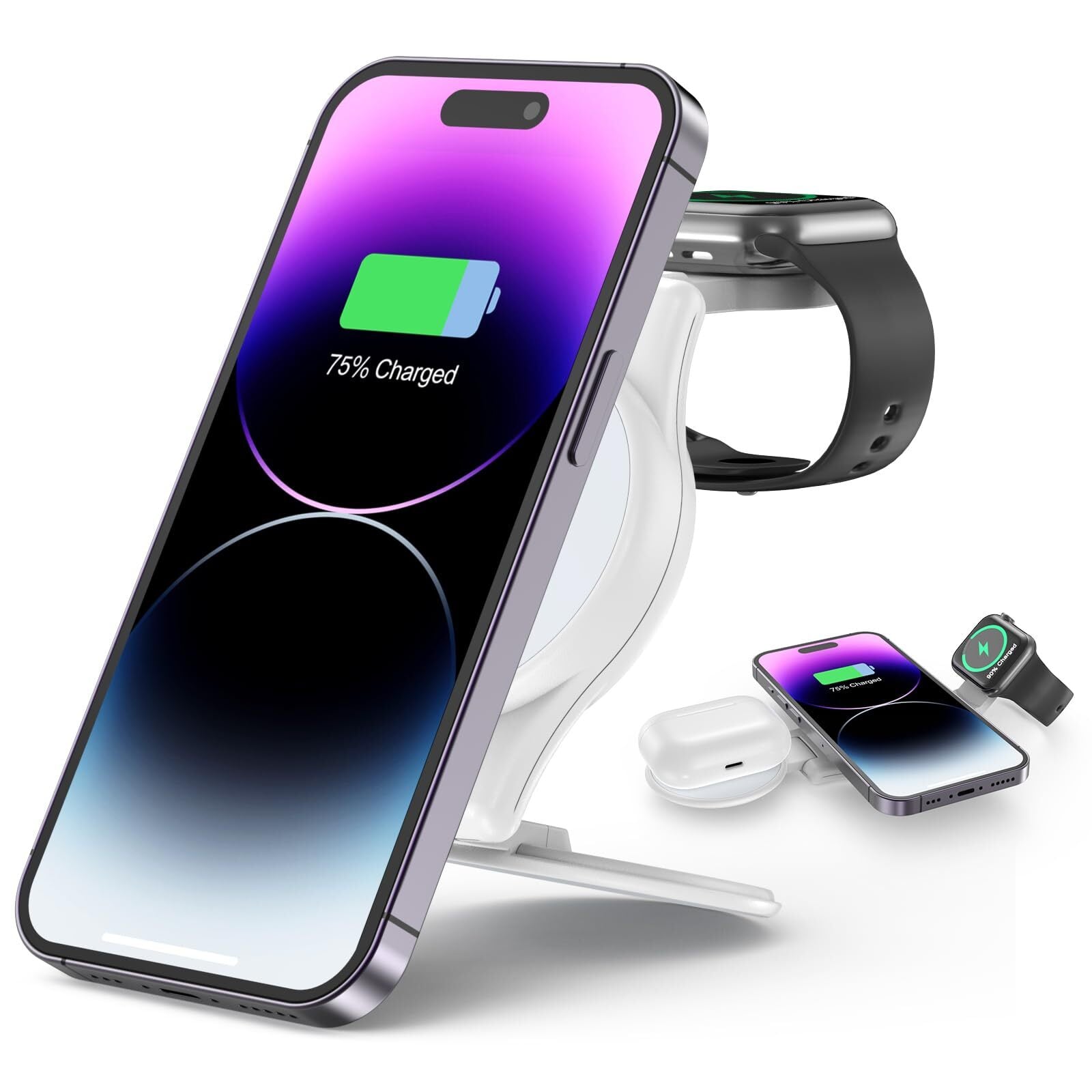 HOUOA magsafe充電器 3in1マグセーフ充電器 折畳み スタンド 特有のapple watch急速充電 iphone アップルウォッチ 急速充電 iPhone 15/14/13/12シリーズ/AirPods/Apple Watchなど対応 マグネット式充電器 軽量 携帯便利(ホワイト)