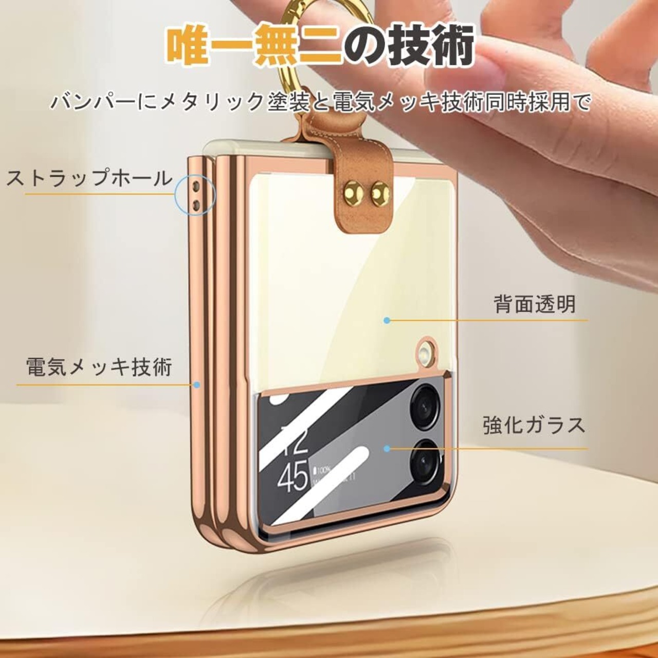 『超薄型軽量 ワイヤレス充電 』Samsung Galaxy Z Flip4 / docomo SC-54C / au SCG17(6.7インチ)用 メッキバンパー リング付きケース。保護力を保ちつつ極限まで薄さにこだわり、まるでケースをつけていないように、より軽薄な体験を楽しめます。薄型のためワイヤレス充電も対応できます。※ご注意:Z Flip4用ケース、Z Flip3と交換性ありません。お買い求めの機種を確認してからご購入をお願いします。