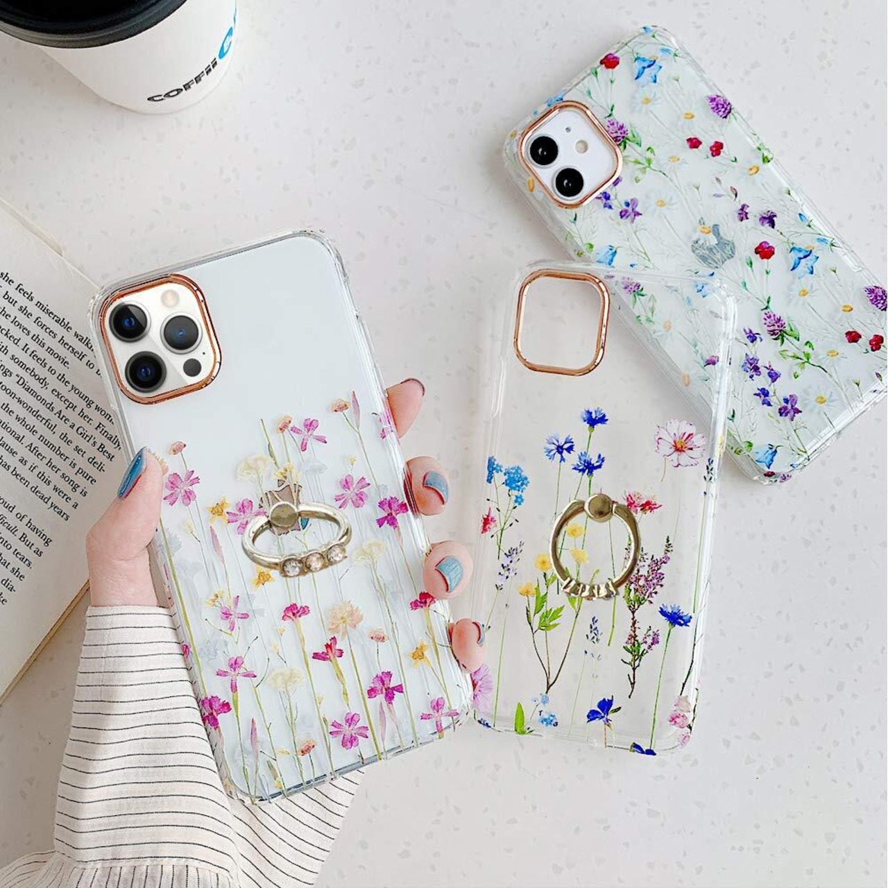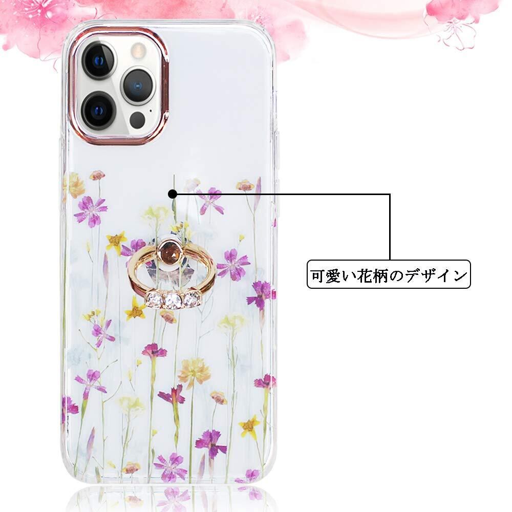 YUYIB iPhone15 Pro ケース リング付き クリア 花柄 可愛い おしゃれ キャラクター 女性人気 耐衝撃 ストラップホール スマホケース 携帯ケース アイフォン15 プロ カバー (iPhone15 Pro 6.1", 花柄リング-2)