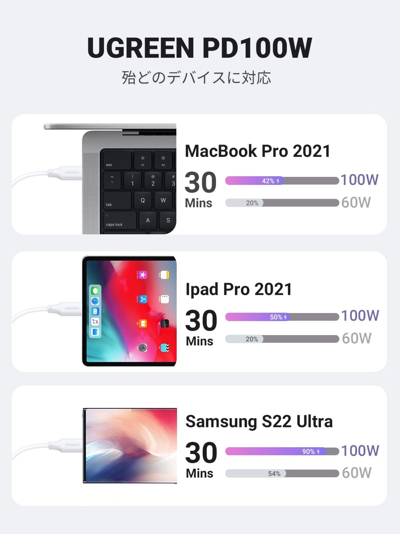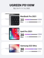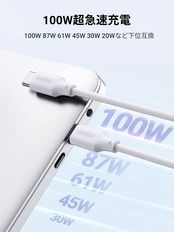 【100W急速充電対応】UGREEN usb c ケーブルはUSB PD技術に対応し、最大100W (20V*5A)まで安全かつ安定して出力できます。PD充電を実現するために、デバイスとアダプタはPD機能をサポートする必要があります。100W 87W 61W 45W 30W 18Wの電力供給PD急速充電をサポートします。