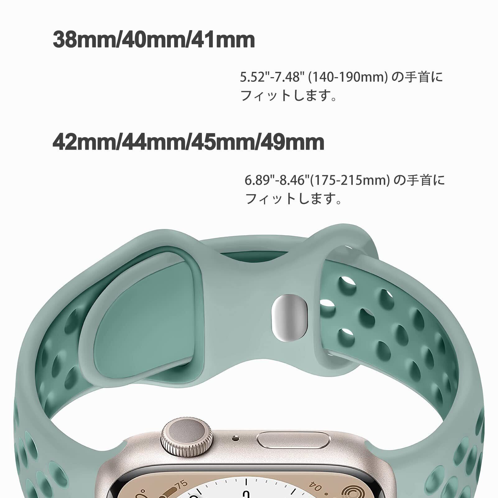 【対応機種とサイズ】コンパチブルApple watch Ultra2/Series 9 /Ultra/Series 8 /Series 7/Series 6 /Series 5/Series 4 /Series SE /Series SE2 /Series 3スポーツバンド。サイズ:38/40/41 mm サイズは 5.52"-7.48" (140-190mm) の手首にフィットし、42/44/45/49 mm サイズは 6.89"-8.46"(175-215mm) の手首にフィットします。(watch の文字盤に合わせて正しいサイズを選択してください。)