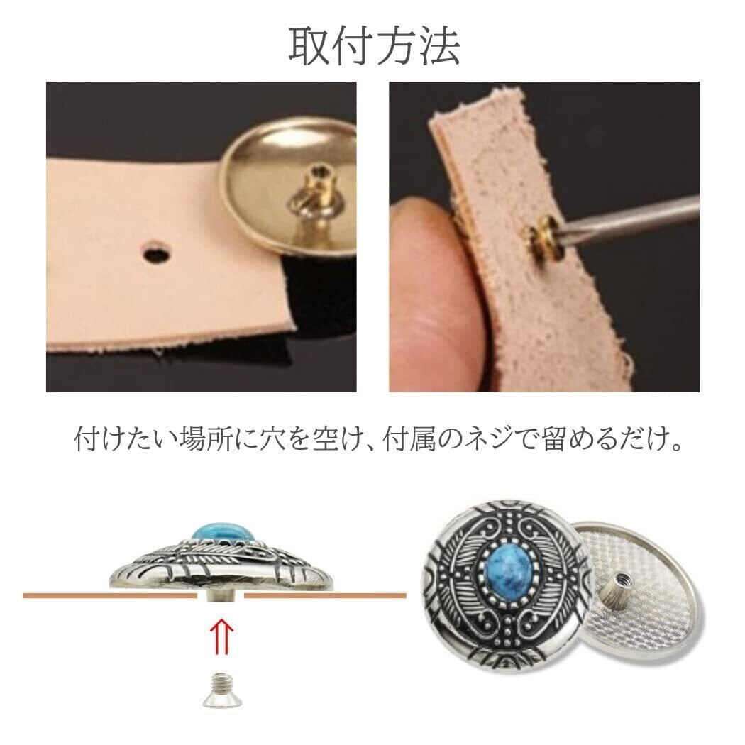 セット内容:コンチョ×12個 留め具として、ネジを2種類24個付属します。 コンチョのサイズ:直径約30mm 、素材:合金(シルバー仕上げ)
