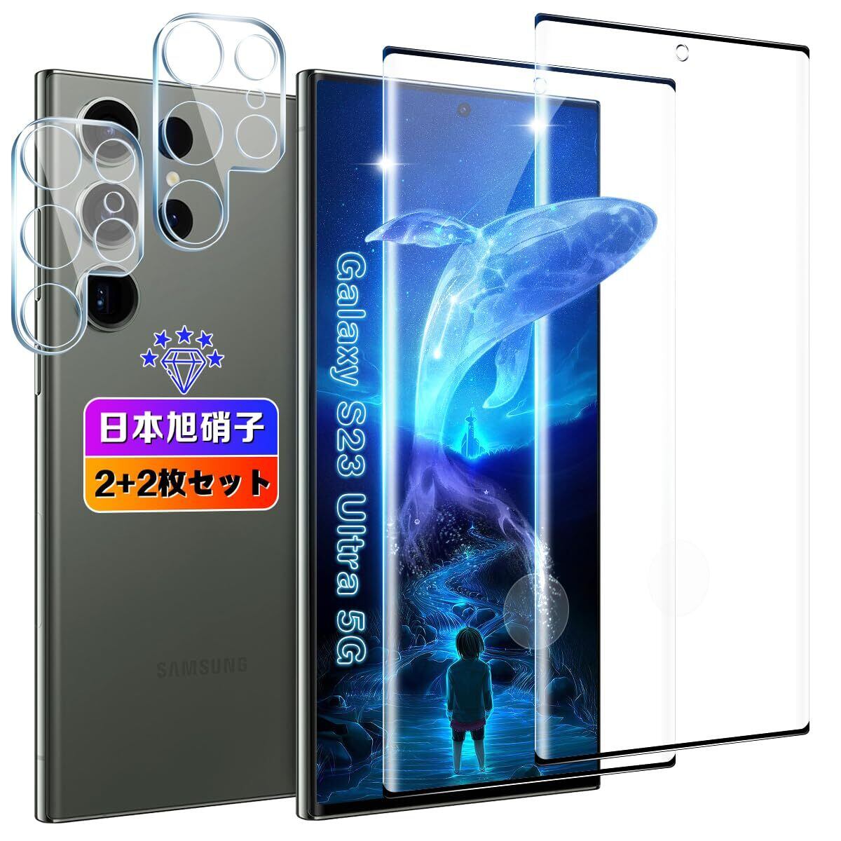 【数量限定】【wnunbg 2+2枚セット】 対応 Galaxy S23 Ultra 5G ガラスフィルム 2枚+ レンズフィルム 2枚 【日本旭硝子素材採用 硬度9H 飛散防止 】 対応 ギャラクシーS23 Ultra 5G フィルム 強化ガラス 液晶 Galaxy S23 Ultra 保護フィルム ケース カバー 指紋認証対応 超薄型0.26㎜ 耐衝撃 引っかきキズに強い 指紋防止 高透過