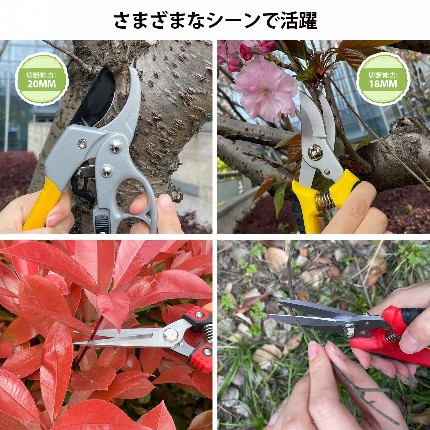 【セット内容】バイパス式剪定鋏*1(木、軟木、繊細な木や植物、生花等の切断) アンビル式剪定鋏*1(堅い枝、枯れ木、自生した強靭な木等の切断) 摘果鋏*1(摘果、芽切、野菜の収穫など柔らかい茎の切断) 鋸歯状の摘果鋏*1(滑り止め鋸歯状デザイン、枝の固定用くぼみがあり、電工ハサミとしても使用可能)