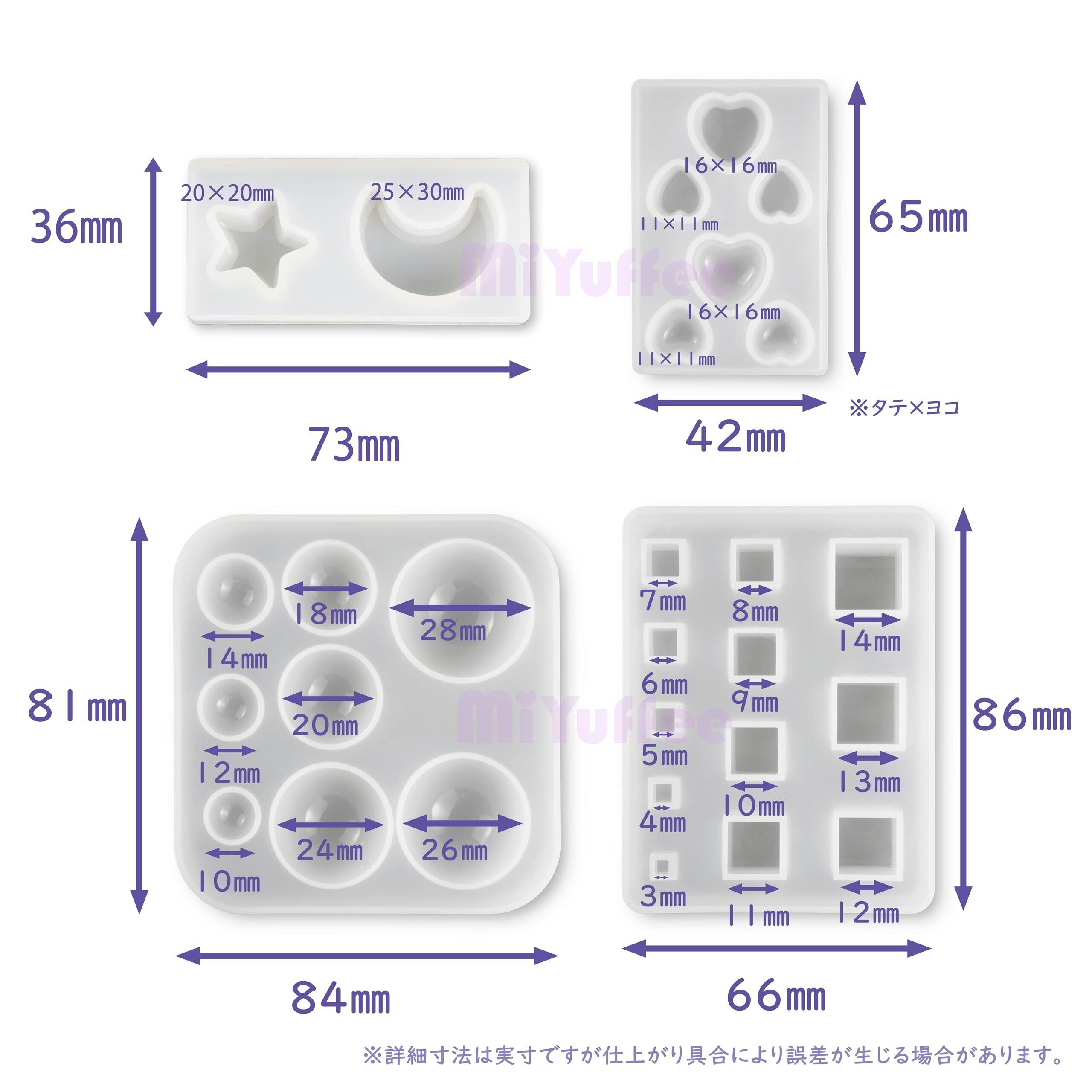 UVレジン、エポキシ樹脂、樹脂粘土などにご利用いただけるシリコンモールドです。半球・キューブ・ハート・月・スターなどアクセサリーパーツの4個レジン型セットです。