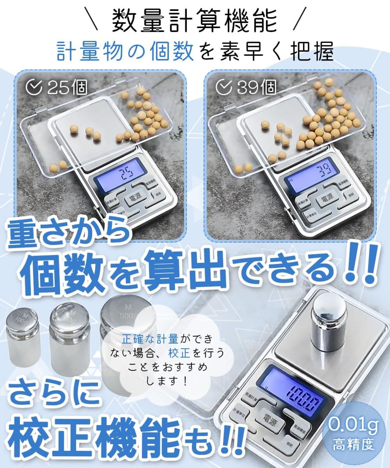 【高精度な計量が可能!】500gまでの精密計量が可能です。0.01g単位の計量精度で、正確な計量を行うことができます。郵便物、コーヒー豆、くすりやサプリなの計量はもちろん、業務用としてもおすすめです。