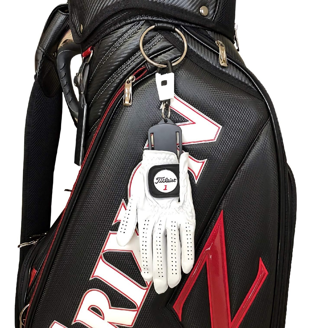 何処でもぶら下げられるようにプッシュ式のキーフックが付属しますのでキャディーバッグやゴルフカートなどに簡単取付可能。手袋に通すことで手袋内に空間を作り、型崩れせず素早く乾燥させる事が可能です。