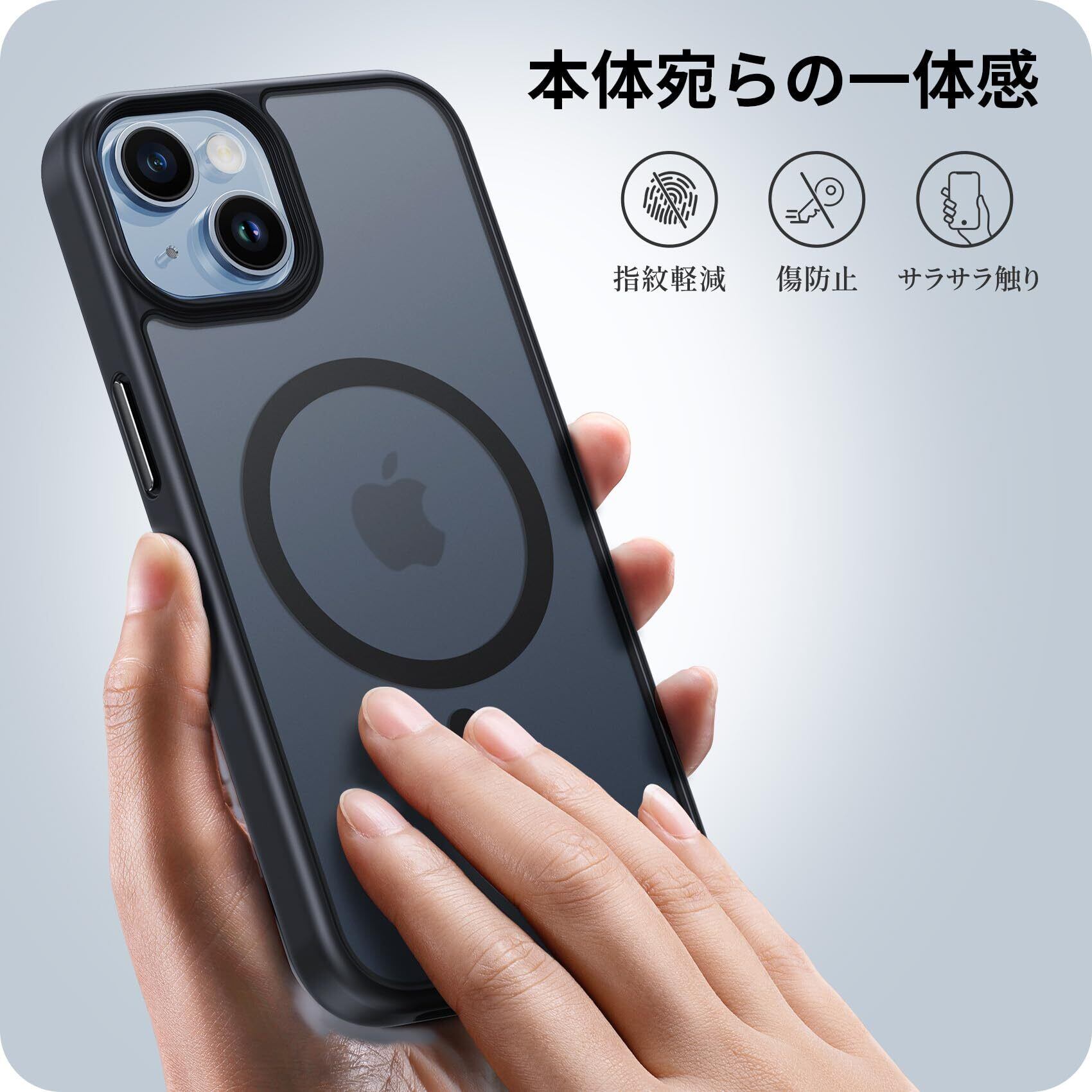 【半透明・マットな仕上げ】背面のポリカーボネートは、耐久性や耐摩耗性に優れ、マットな質感でサラサラして触り心地がすごく良いです。表面には指紋防止ナノオコーティングを施しており、指紋つく心配はありません。特に、背面は半透明で、高級感と神秘感が溢れ、iPhone14 / 13のかっこいいリンゴロゴが見えます。