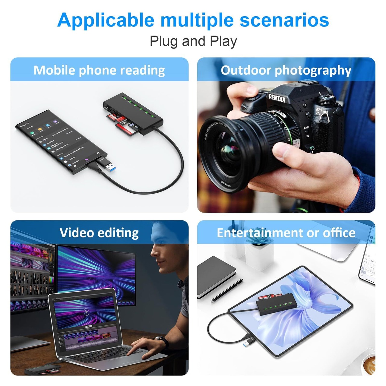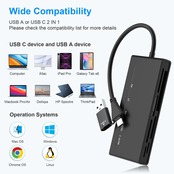 7-in-2 USB C カードリーダー: この メモリーカードリーダーは、ほとんどの標準メモリカードをサポートし、各カードのニーズを満たすことができます。 このカードリーダーには、CFスロット1つ、SD2つ、TF (Micro SD)、MS1つ、XDカードスロット1つが装備されています。 しかも、このマルチカードリーダーは 5 種類のカードを同時に読み取り、書き込みできるので、プラグアンドプレイ、作業効率が大幅に向上します。