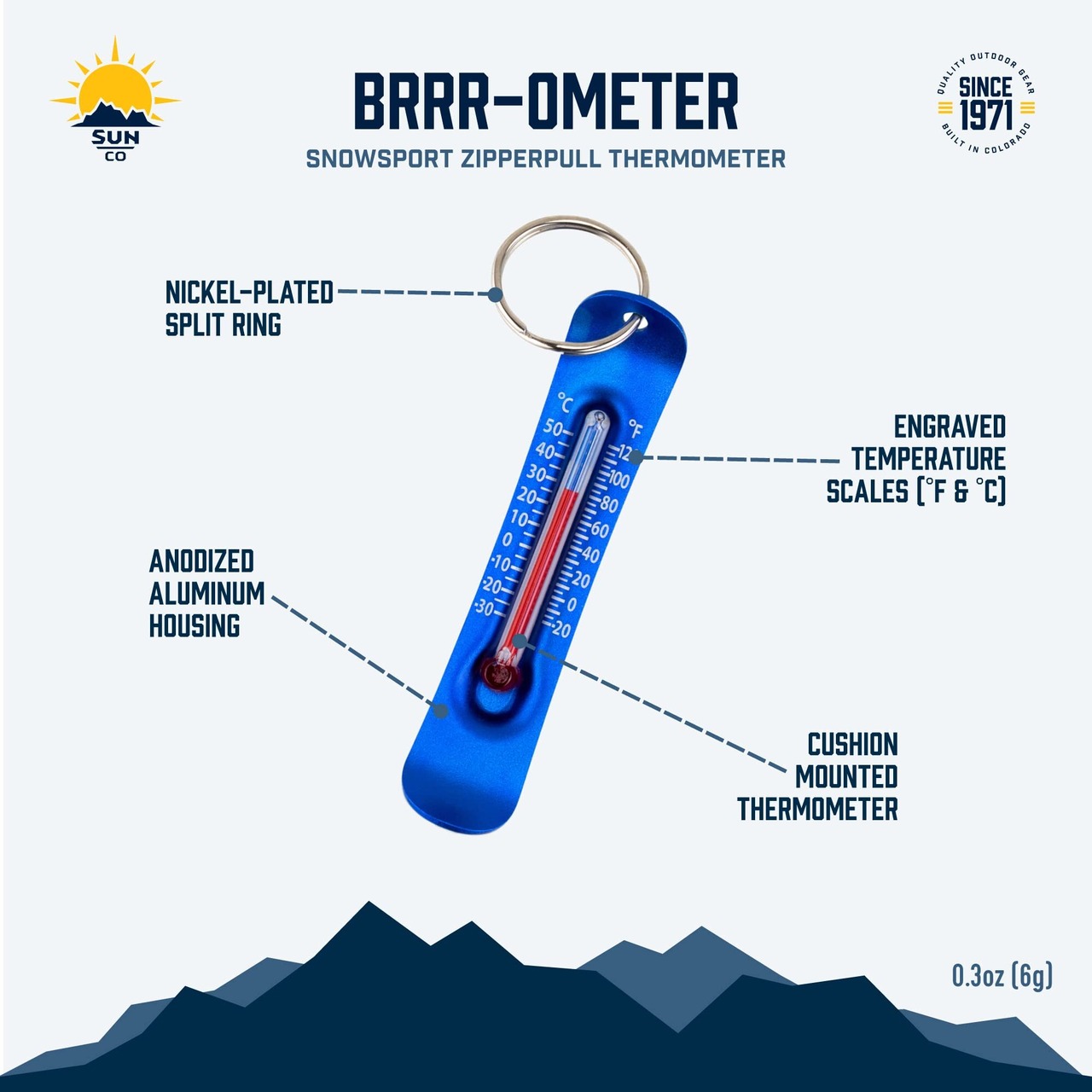 温度をさっと確認でき、スノースポーツに最適な独自のデザインです。アルマイト製ハウジングとクッション付き温度計の組み合わせです。-30°C (-20°F)まで測定できます。米国内で設計と組み立てを行っています。ジッパーに最適な金具となるほか、キーリングとしても便利です。正確な米国製の温度計です。