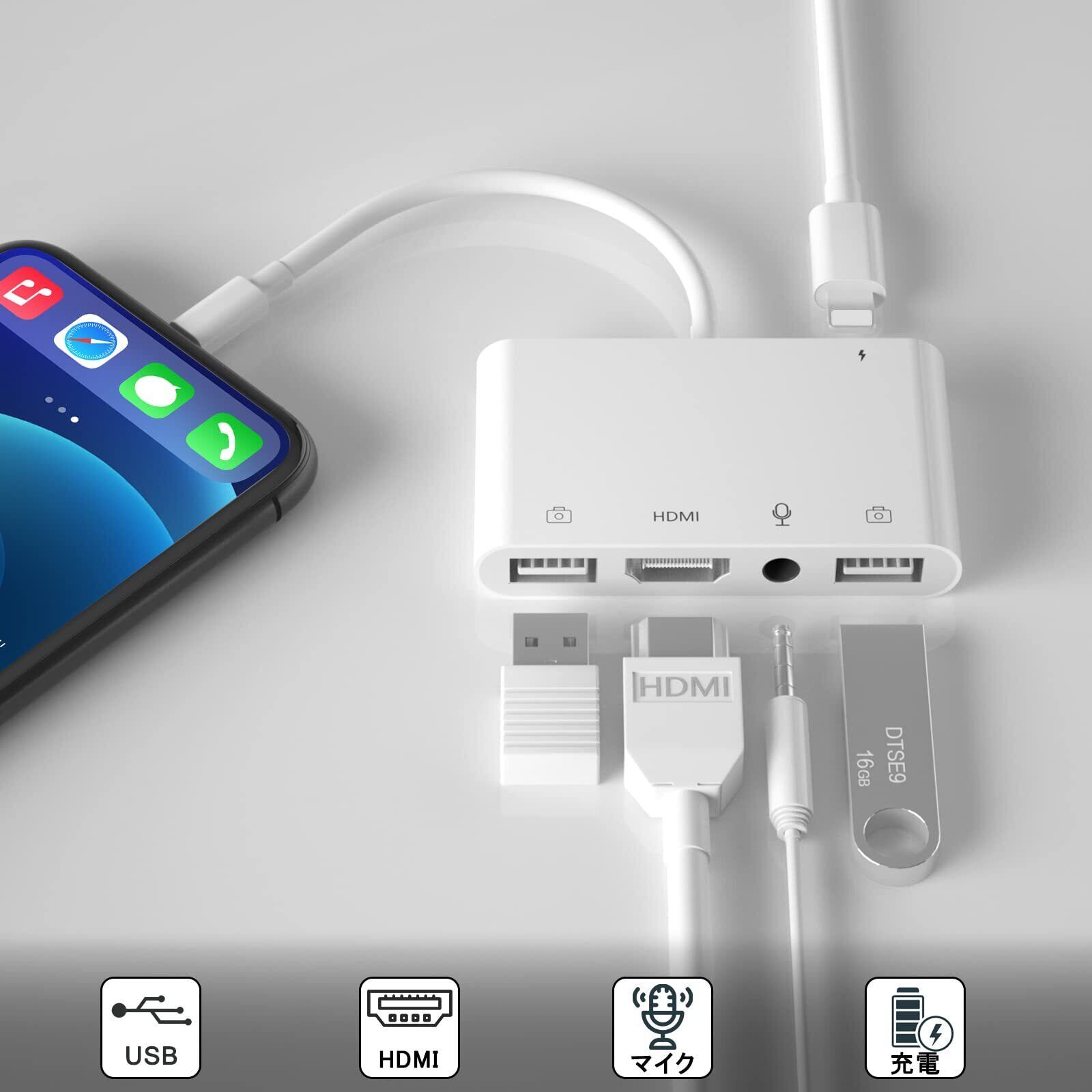 【2022最新】phone hdmi変換ケーブル Lightn-ing to HDMI+USB*2+3.5MM 変換アダプタ HD1080P ライト-ニング Digital AVアダプタ USB OTGカメラアダプタ 双方向 写真/ビデオ高速転送 3.5 mmヘッドフォンジャックアダプタ iPhone/iPad専用(iOS対応)