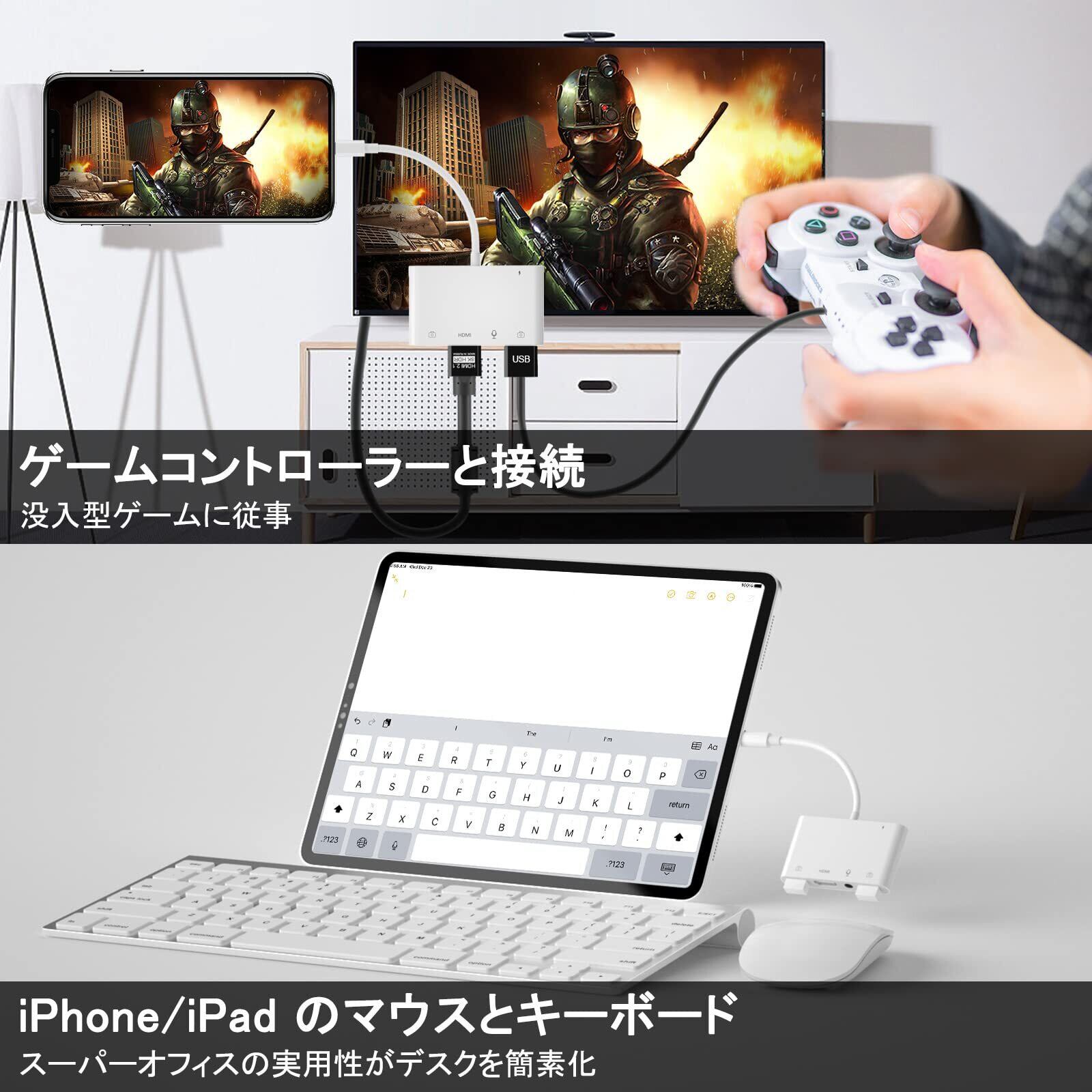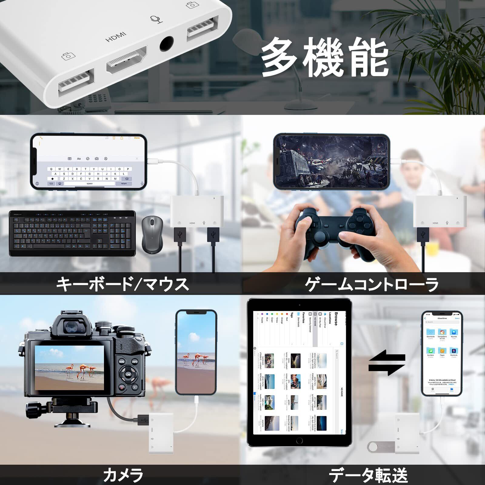【圧倒的な5in1 HDMI/USB*2/3.5mm 変換アダプタ】lightn-ing to HDMI USB 変換アダプタがiphone、ipad、iPodでの動画をHDMIとUSB ポートを搭載したテレビ、プロジェクターなどに出力できます。更に同時にHDMIとUSB+Audio二つの出力方式が可能で、会議中や授業中でスクリーンが不十分である悩みを解消します。