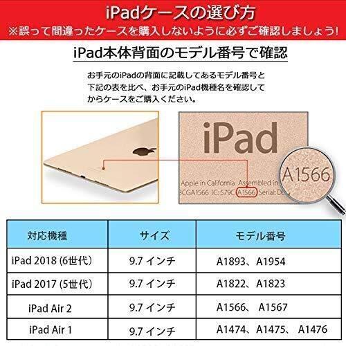 【対応機種】:2018年と2017年発売のiPad 9.7インチ(型番A1893、A1954、A1822、A1823)とipad air/ipad air2(型番A1474、A1475、A1476、A1566、A1567)。※2016年発売のiPad Pro9.7(型番A1673/A1674/A1675)に対応不可!