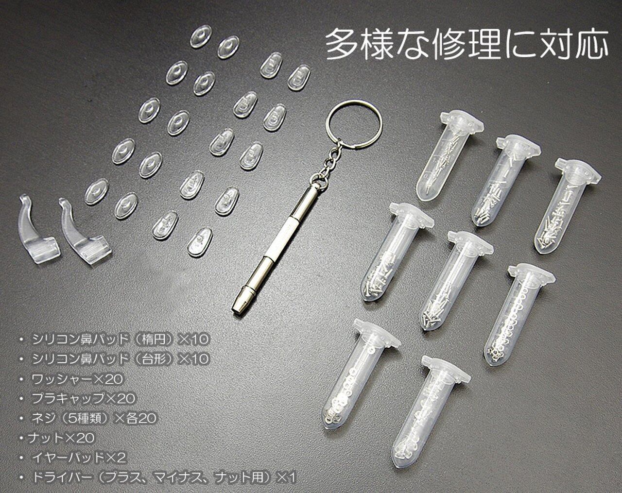 シリコン鼻パッド(楕円)×10 シリコン鼻パッド(台形)×10 ワッシャー×20 プラキャップ×20 ネジ(5種類)×各20 ナット×20 イヤーパッド×2 ドライバー(プラス、マイナス、ナット用)×1