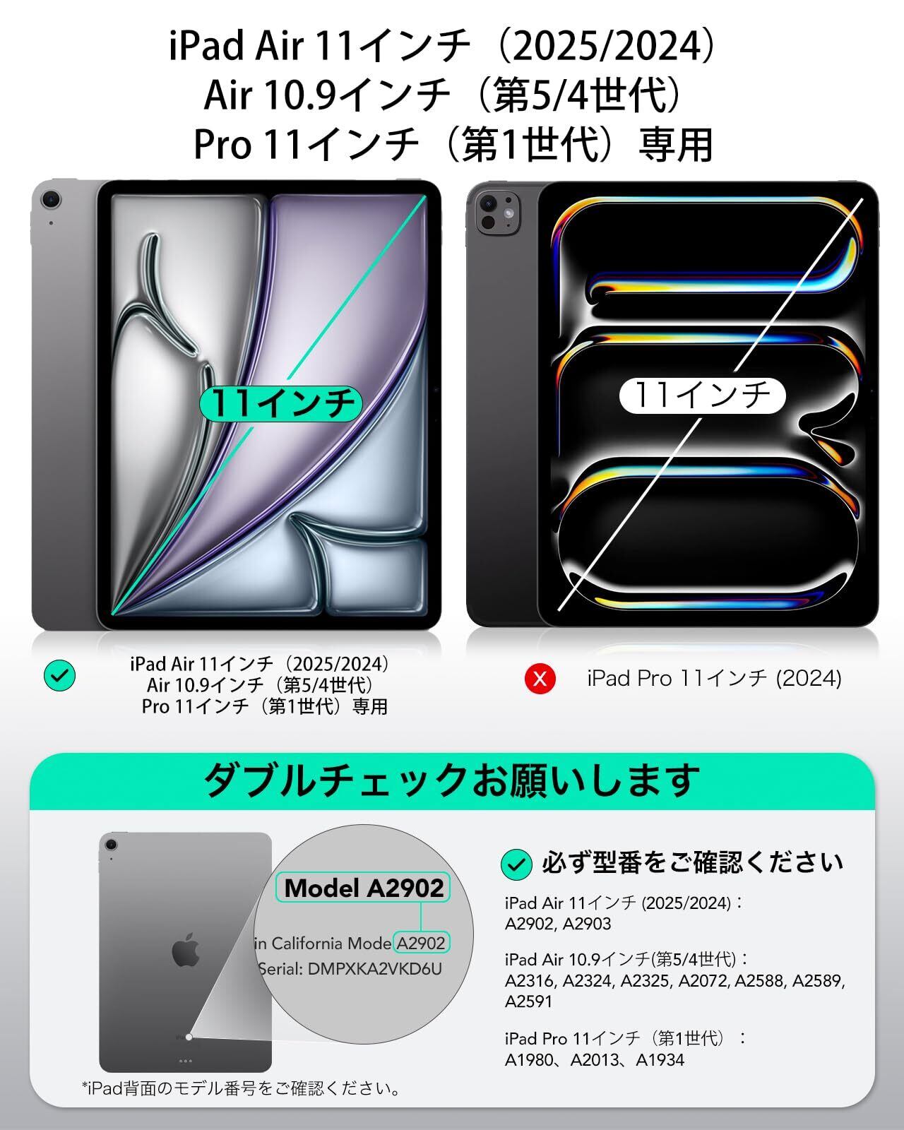 【互換性】:iPad Air 11インチ(2025/2024)、iPad Air 第5/4世代(2022/2020)、iPad Pro 11インチ(2018年)専用です。モデル:A2902、A2903、A2316、A2324、A2325、A2072、A2588、A2589、A2591、A1980、A2013、A1934,他のiPadモデルと互換性がありません