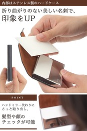 名刺の角が折れない - ステンレス製のハードタイプ 名刺入 れなので大事な名刺に折り目をつけません。 ビジネスマンの顔といっても過言ではない「名刺」を、常にベストな状態で持ち運ぶことは仕事の成績にも繋がるものだと考え、名刺が折れないデザインに拘りました。