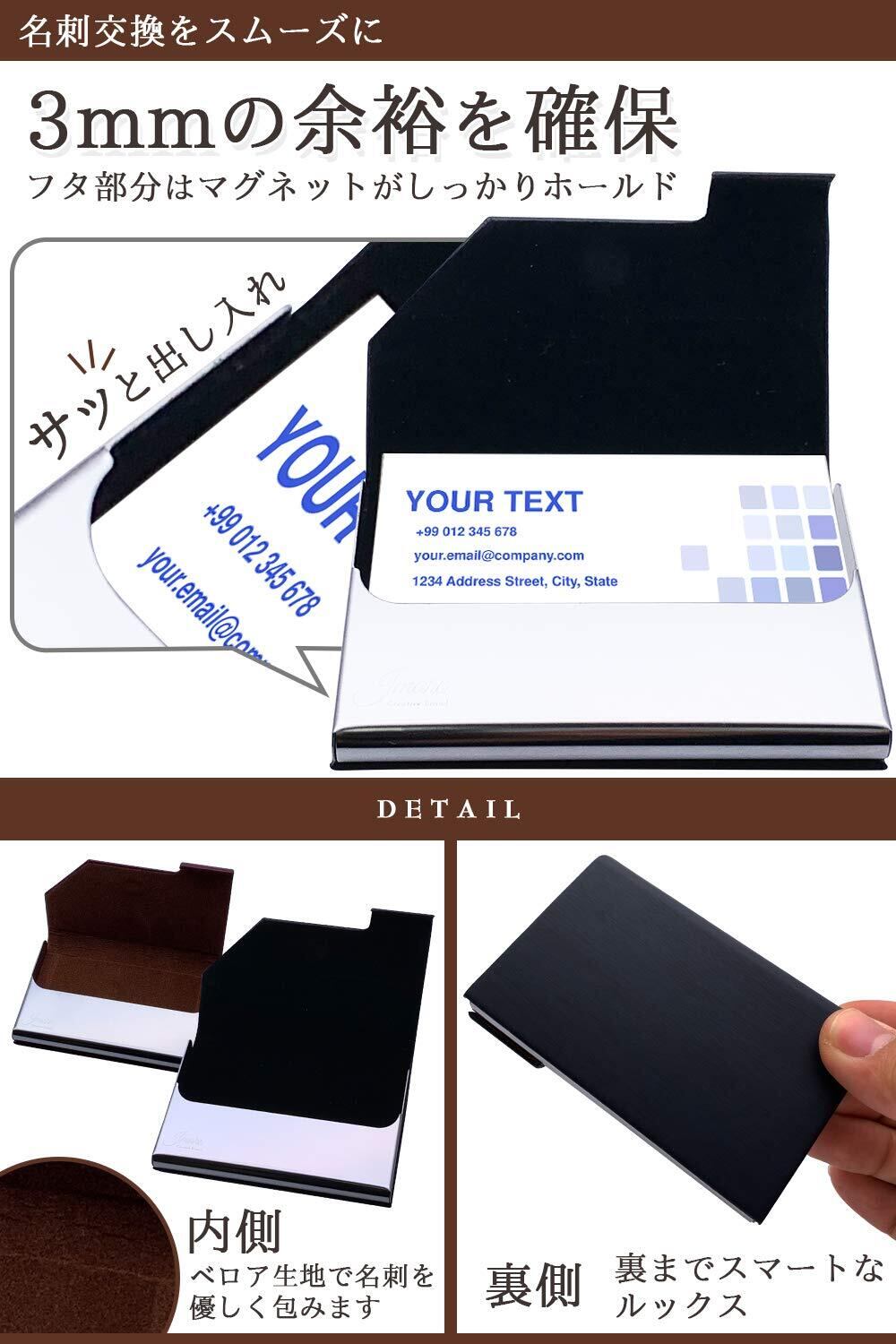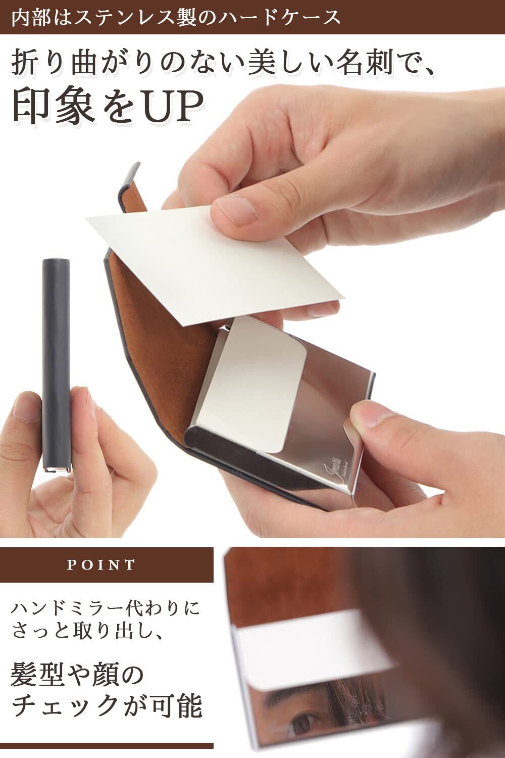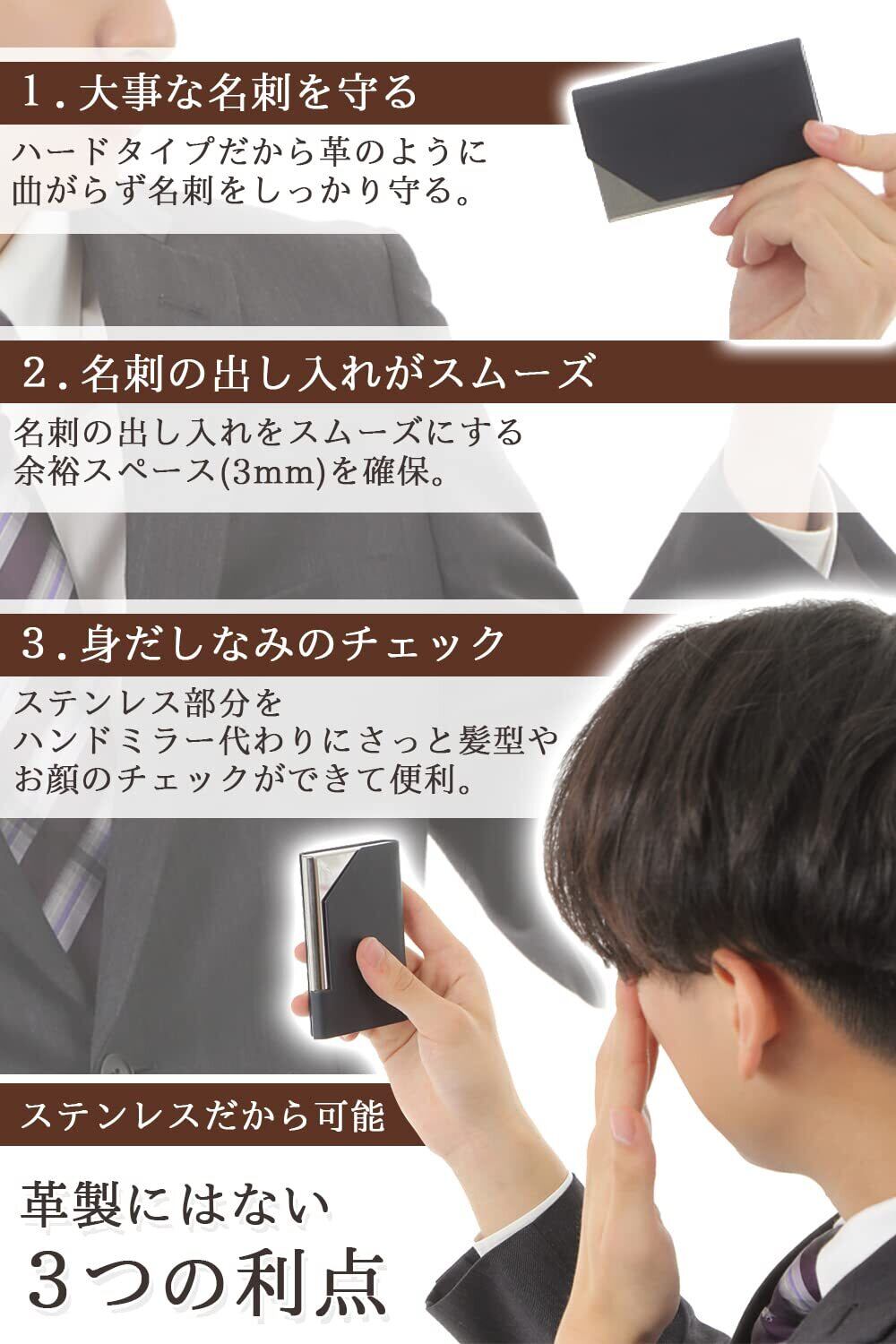 見た目すっきり実用的な収納サイズ - 25枚程度の名刺を収納できる厚みにしました。厚みを増せば収納枚数を増やすことはできますが、見た目と実用性のバランスを考えた結果、この収納サイズに至りました。 ※薄く、スッキリしている方が整理整頓のできる、きっちりとした人間であるという印象を相手に与えることができると考えています。本体サイズ:9.5×6.5×1.2cm、重量:約58g