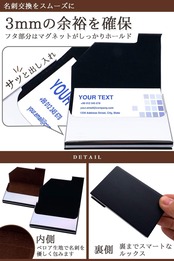 スムーズ開閉、散らばりを防ぐマグネット蓋 - 名刺の出し入れ時はスムーズに開閉でき、バッグやポケットの中に収納している時は勝手に名刺が飛び出てしまわないように蓋部分の内側に磁石を採用。 一瞬で名刺が取り出せる便利さと、名刺の紛失を防ぐ安心感をあなたへ。
