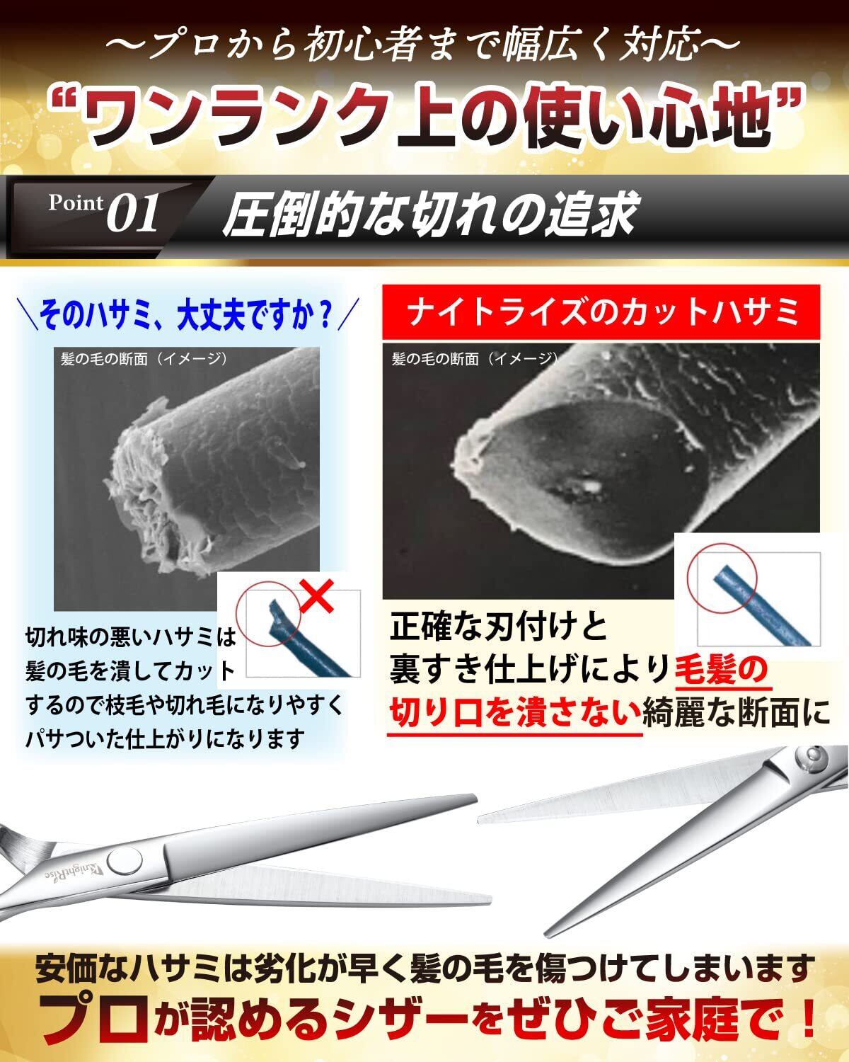 【プロ美容師が徹底監修】 ナイトライズのヘアカットハサミは理髪用ハサミを専門に取り扱っている20社以上の工場からサンプルを取り寄せ、美容師の方に1本1本試し切りしてもらいました。 切れ味、グリップ形状など、一番“使いやすい”ハサミを選んでもらい、細かい改良や修正を繰り返して完成したこだわりの1本です。