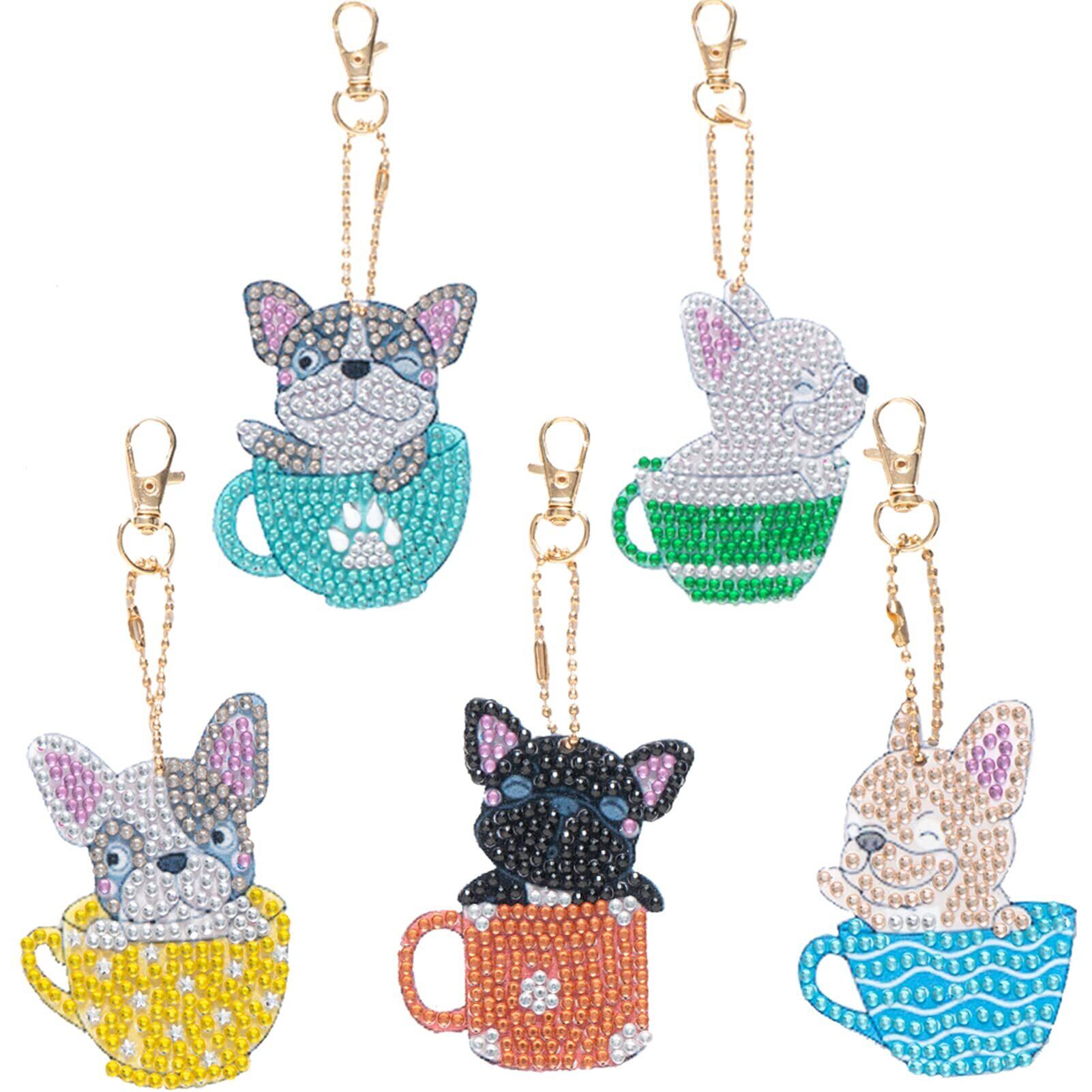 Amyaker ダイヤモンドアート キット DIY キーホルダー 5Dダイヤモンド塗装キット ダイアモンドビーズ キーホルダー 両面全貼り付け DIY手作り キーホルダー 財布 キーペンダント バッグ 装飾用 コップ犬 5個入