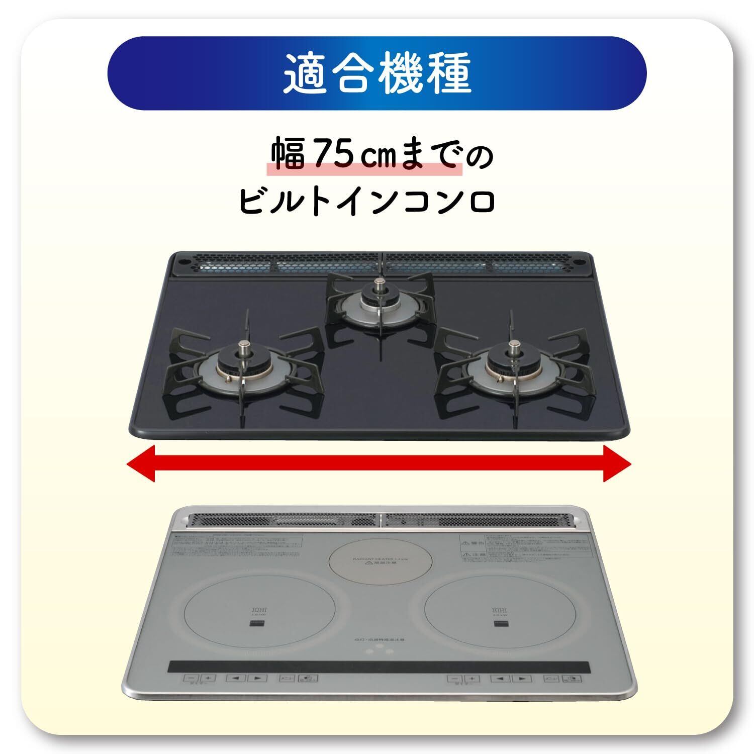幅75cmまでのコンロに取付け可能なフリーサイズで、キッチンに自然に溶け込むクリアカラーを採用。