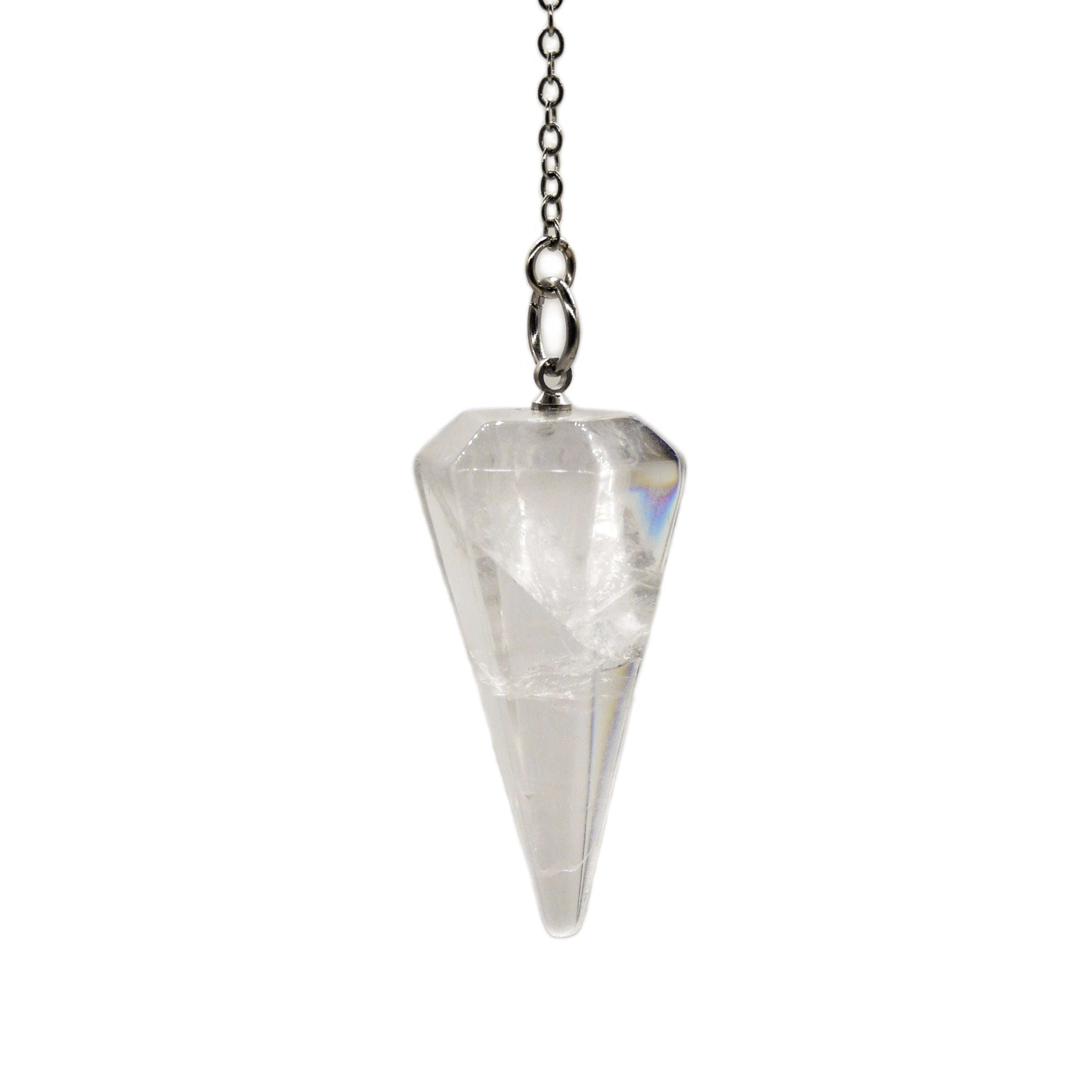 天然石パワーストーン ペンデュラム振り子、 ダウジング風水占い用、 天然水晶透明クォーツ製、ヒーリングストーン チャウラストーン六角錐 6面カット、金属チェーン付き