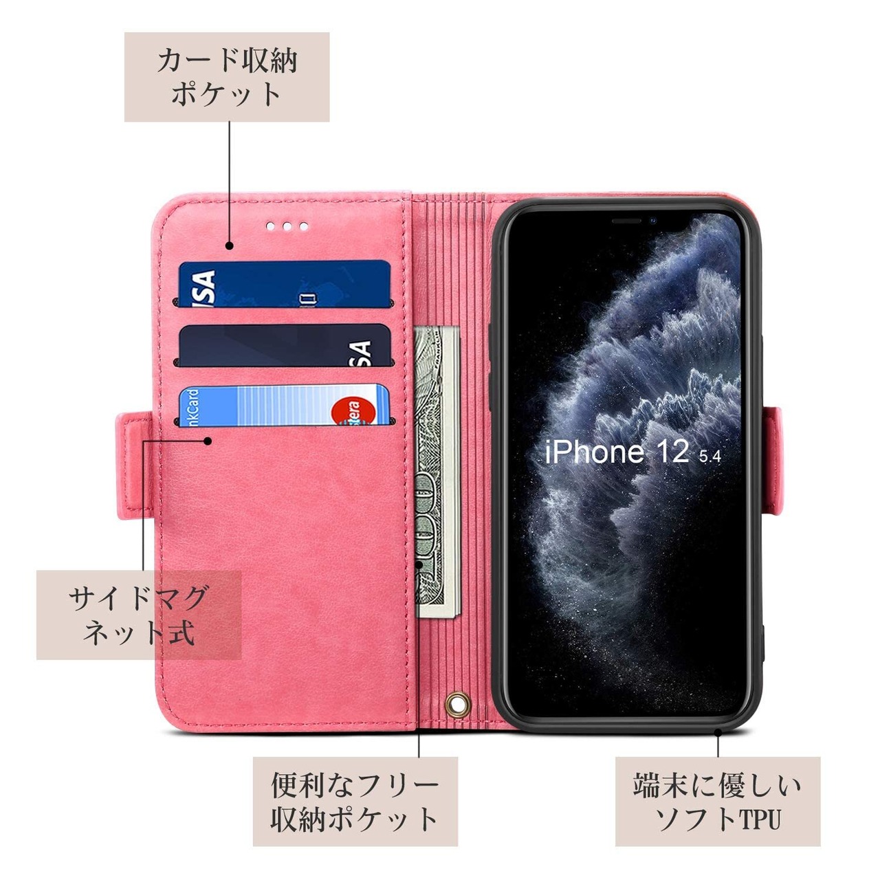 使い勝手抜群のiphone 12 mini手帳型ケース、手帳型カバーの機能が搭載して、内側には三つのカード入れとフリーポケットがつき、カードや定期券の収納に優れていて、横置きにしてスタンドになり、動画視聴がすごく便利なスマホケースです。