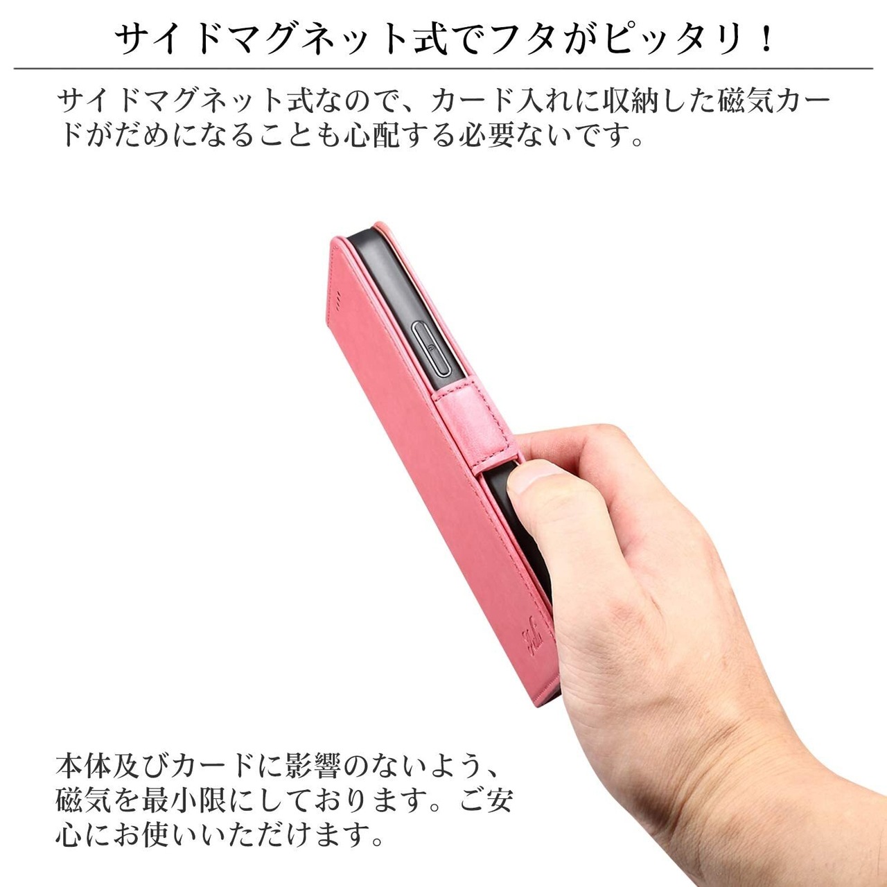 サイドマグネットの接着力と保護力、サイドマグネットタイプで、マグネット接着力がちょうどいい強さで閉じれば自然と引き合ってピタッと閉まります。インナーケースはソフトTPUで携帯本体をしっかりガードしており、手帳型なので画面も保護できます。