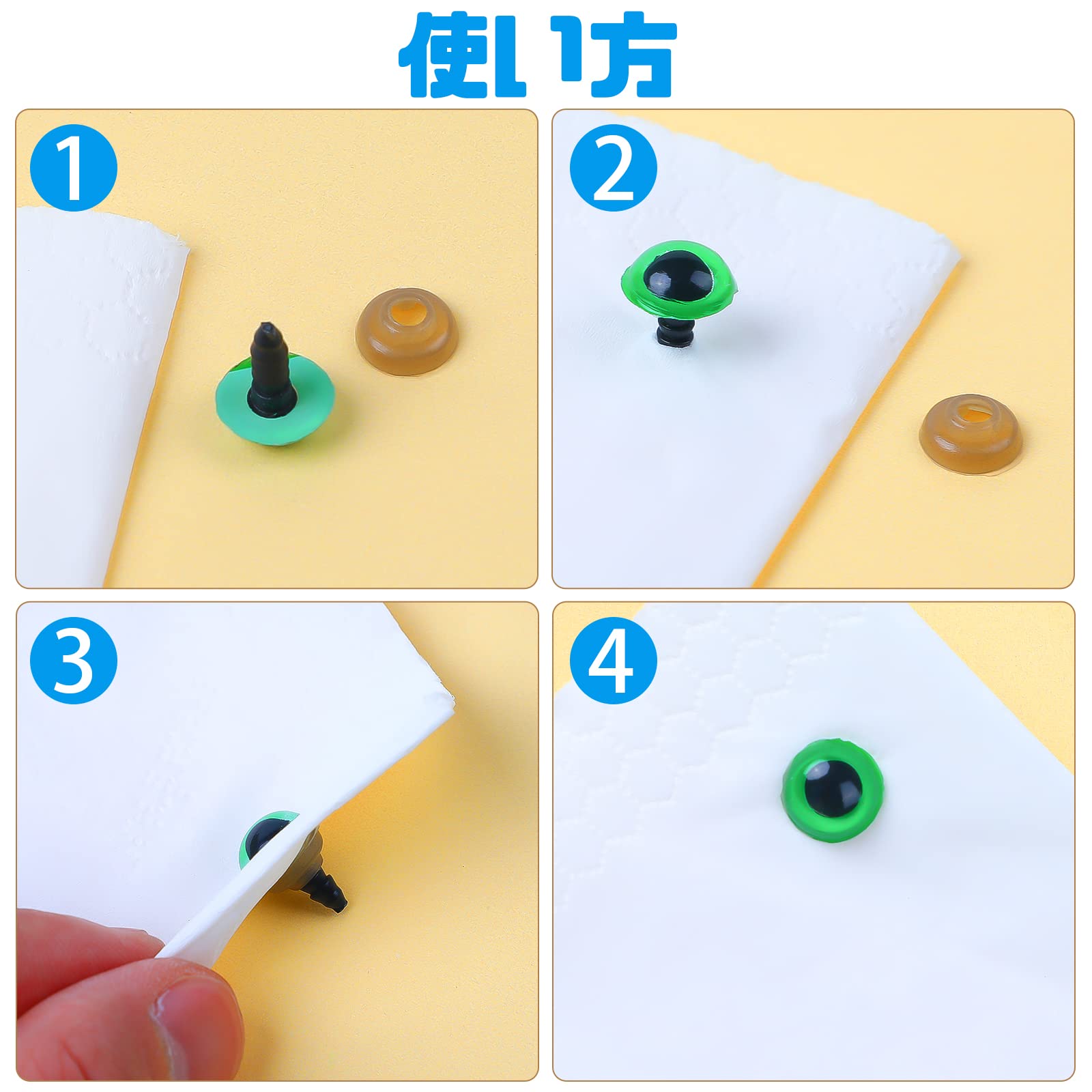 【使い方簡単】ぬいぐるみ目の使い方は簡単です。差込み式のものの本体に目打ちで穴を開け、そこに差込み、ボンド接着して留めます。「編みぐるみ」など穴(編み目)が大きいものは、抜けないように生地などで補充をしてお使いください。 生地の補充:立体にする前に目の位置に裏から同色の布を当て、その布に穴を開け、目と本体を接着します。