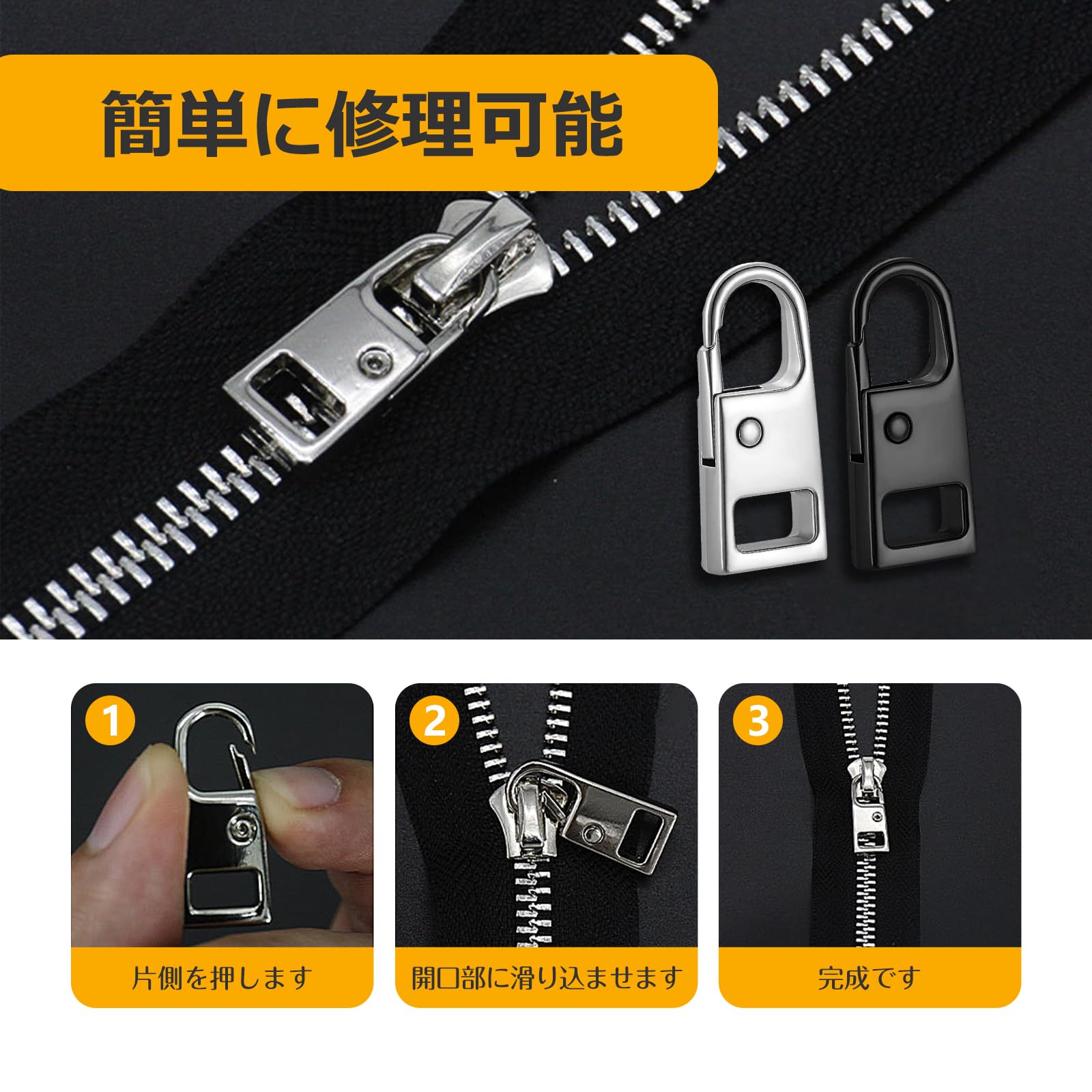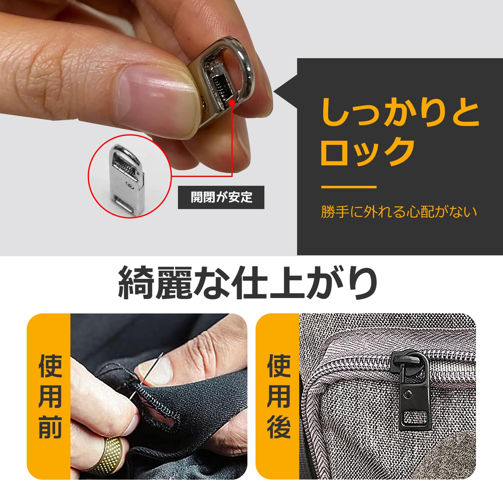 【簡単に修理可能・工具不要】ファスナー引き手にはカラビナのようなロック機能が備わって、使い方は非常に簡単です。片側を押して開口部に滑り込ませると、引き手がスナップバックして固定されます。これによって、ファスナーの開閉が安定して行え、引き手が勝手に外れる心配がありません。引き手が壊れた場合、工具を使用せずに交換が可能で、プロセスは数分で行うことができます。