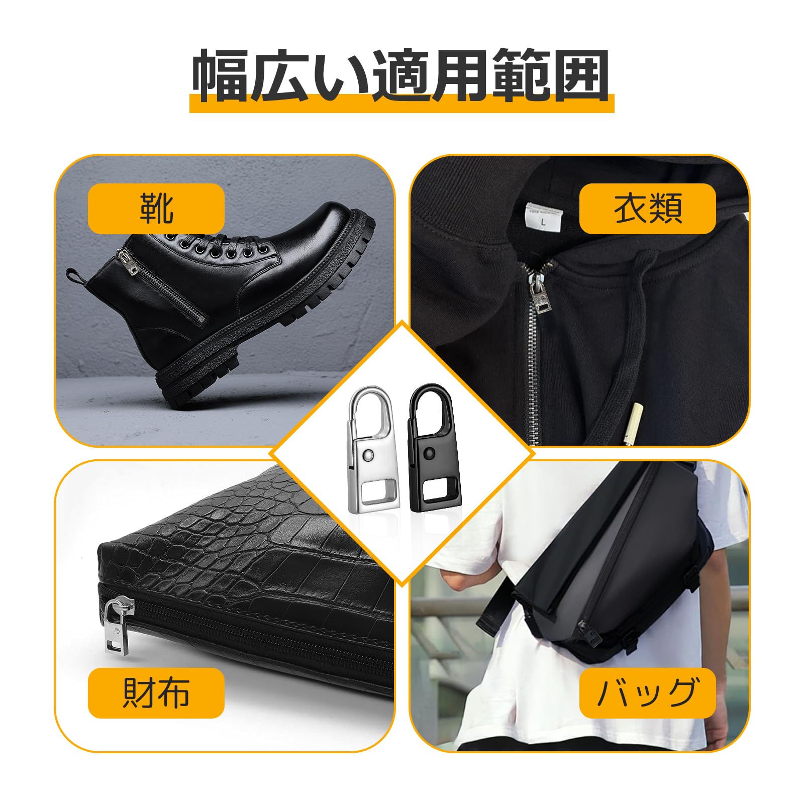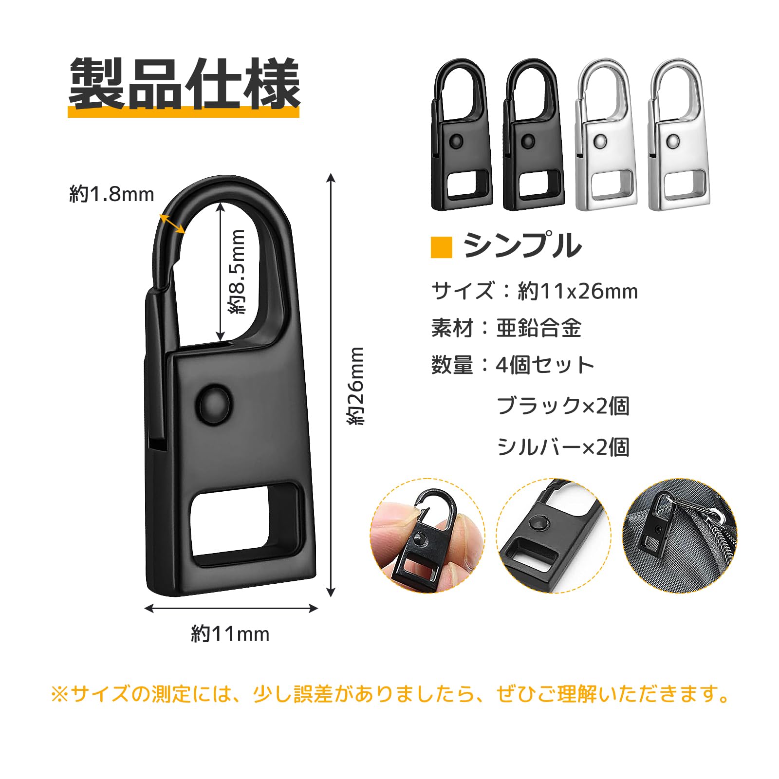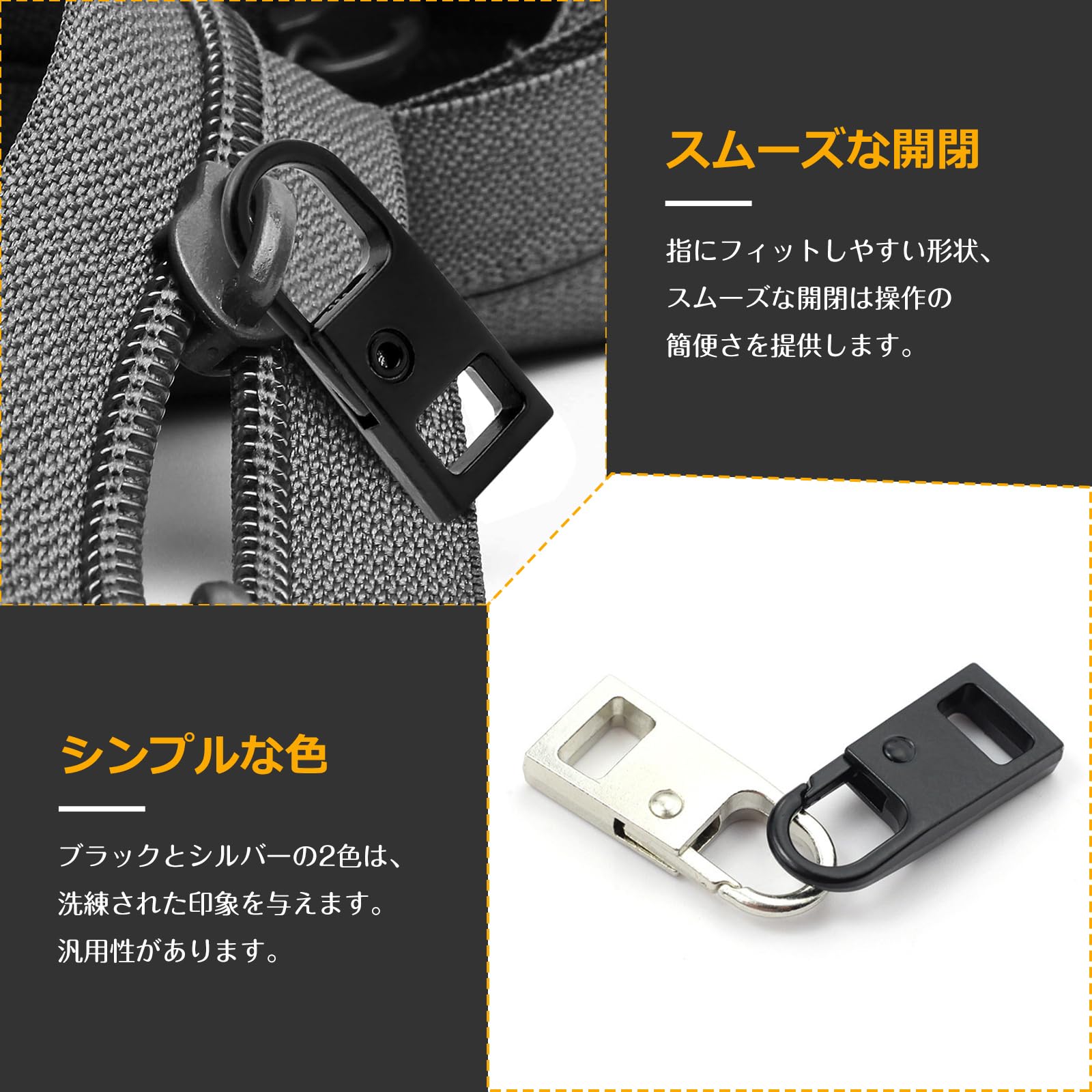 【シンプル・スムーズな開閉】ブラックとシルバーの2色各2個ずつのセットがあるということです。一度に複数のアイテムに取り付けることができます。シンプルさから洗練された印象を与えます。サイズが約26mm×11mmです。引き手が指にフィットしやすい形状をしていった、開閉の操作が容易になります。スムーズな開閉はストレスを軽減し、操作の簡便さを提供します。