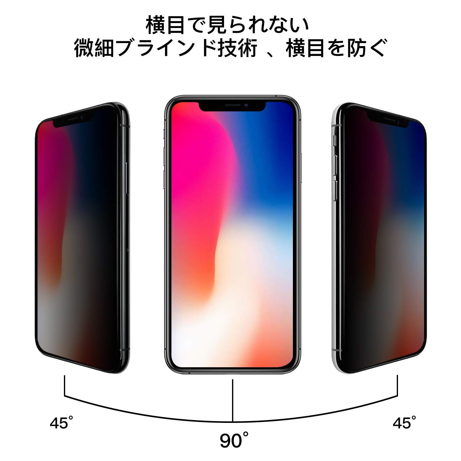 【覗き見防止】極細なルーバー光学技術を採用され、左右の視野角を制限し、左右から視線が30°以内にが画面が真っ黒になり覗かれません、スマホの正面にいるユーザーだけ画面内容をクリアに見えます。覗き見防止の特殊設計で、満員電車やバスでの移動の際、隣の視線や向かい側頭上からの視線等から画面をガードし、プライバシーを保護しますまた、室内より、室外(明るい場所)で覗き防止効果効果がよいです。ブルーライトカットの加工も施されているため、目にも優しいです。
