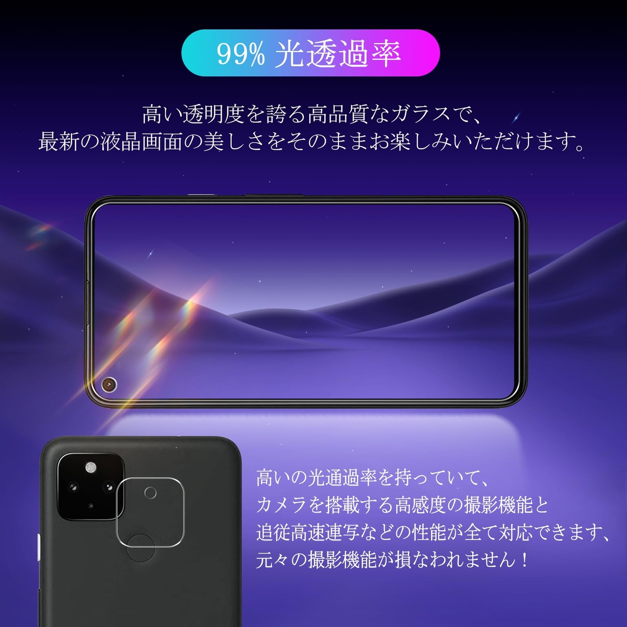 【極薄・超クリア・感度が高い】Google Pixel 4a 5G 保護フィルムは、通常の液晶保護フィルムよりも高級なガラスを採用して作られており、高精細で透明な保護フィルムが最高な解像度があることを確保し、透明度も高くて99%に達し、高透明度で高精細な見る体験を現実しました。Google Pixel 4a 5G 画面のオリジナルの写真品質を維持できるカメラ レンズ プロテクターは、ユーザー様にとてもクリアな表示と写真撮影の体験を与えます。そして厚さが0.26mmの極薄強化ガラススクリーンプロテクターは最高レベルで画面保護を実施しながら、本来の感度と触感を保持して、優れた使用体験をもたらします。