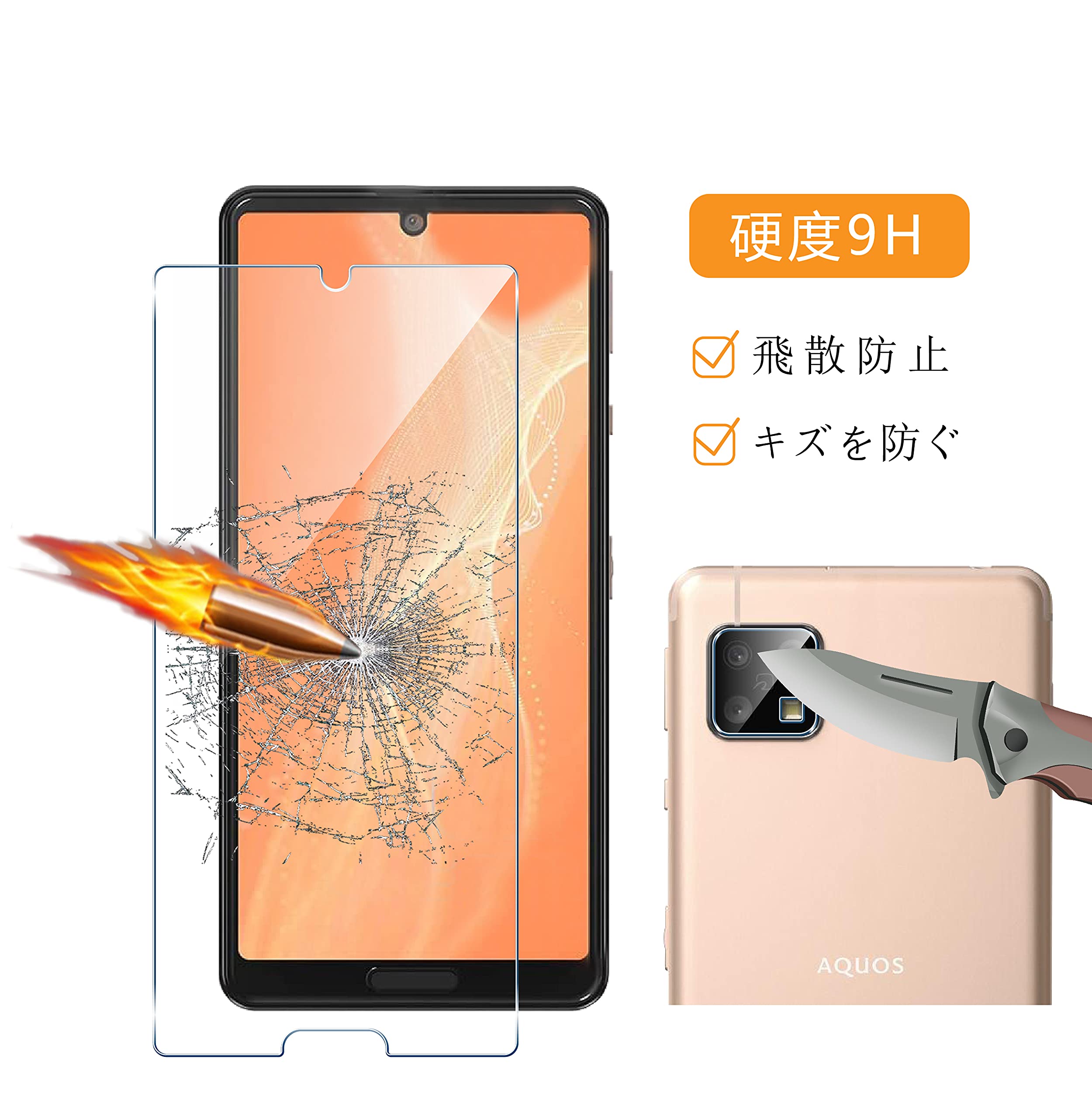 【日本製素材旭硝子製】硬度 9H (ナイフよりも硬い)の高品質な強化ガラスを採用し、ハードコーティング技術により外部からの衝撃をフィルムが吸収し、スマホを様々なものから保護し、鍵、コイン、砂などの傷を防ぎます。