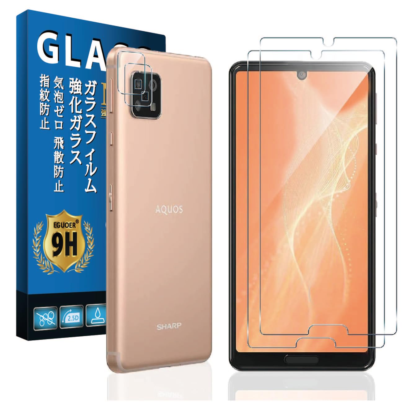 【2+2枚 日本旭硝子製 】 対応 AQUOS sense4 / sense4 lite / sense 5G 用の ガラスフィルム 2枚 + カメラフィルム 2枚 保護フィルム 全面保護 対応 アクオスセンス4 (SH-41A) AQUOS Sense 5G (SH-53A SHG03) Sense4 Lite SH-RM15 フィルム レンズ保護フィルム 硬度9H 飛散防止 撥油性 防指紋 高透過率 自動吸着 対応 sense 4 lite ガラスフィルム