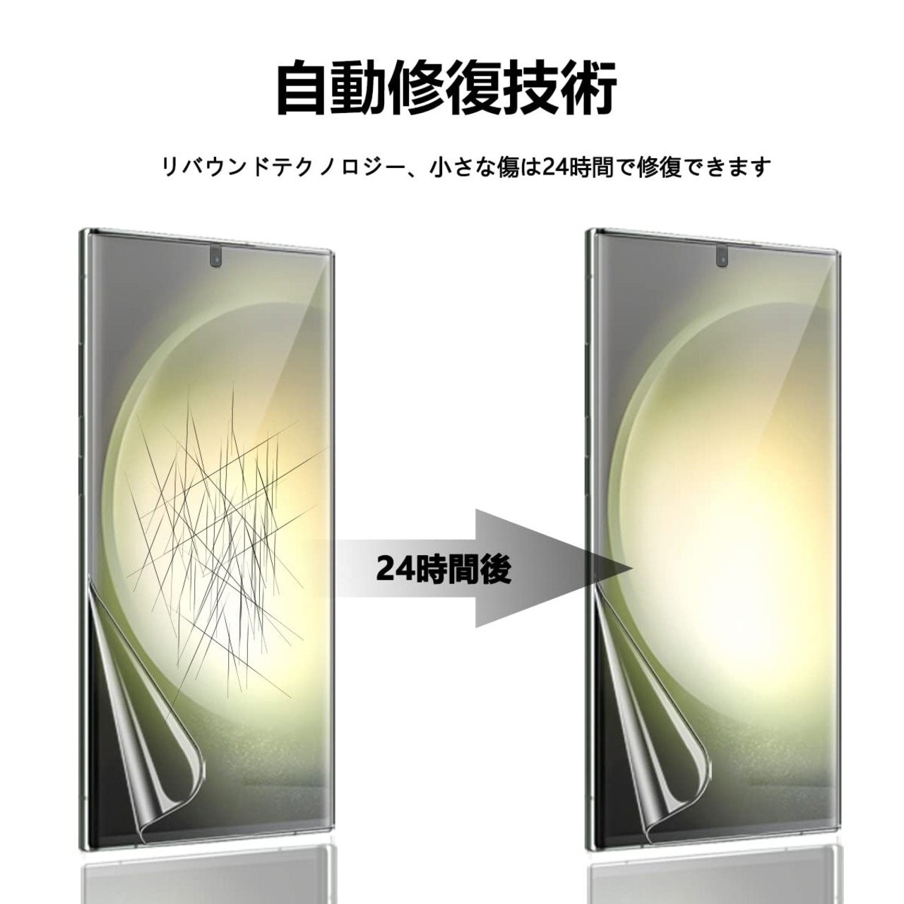 【自動修復】このスクリーンプロテクターフィルムはリバウンドが遅い技術です。 細かいキズや気泡は24時間自動補修。 フィルムを貼り付けた後も画面に気泡が残っている場合は、すぐに新しいフィルムをはがさないでください。 しばらくお待ちください。フィルムは自動的に修復されます。