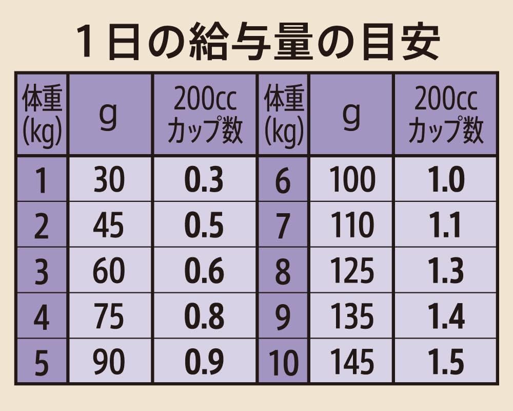 【給与量】1日の給与量の目安 体重 1kg:30g(200㏄カップ0.3)、2kg:45g(200㏄カップ0.5)、3kg:60g(200㏄カップ0.6)、4kg:75g(200㏄カップ0.8)、5kg:90g(200㏄カップ0.9)、6kg:100g(200㏄カップ1.0)、7kg:110g(200㏄カップ1.1)、8kg:125g(200㏄カップ1.3)、9kg:135g(200㏄カップ1.4)、10kg:145g(200㏄カップ1.5)