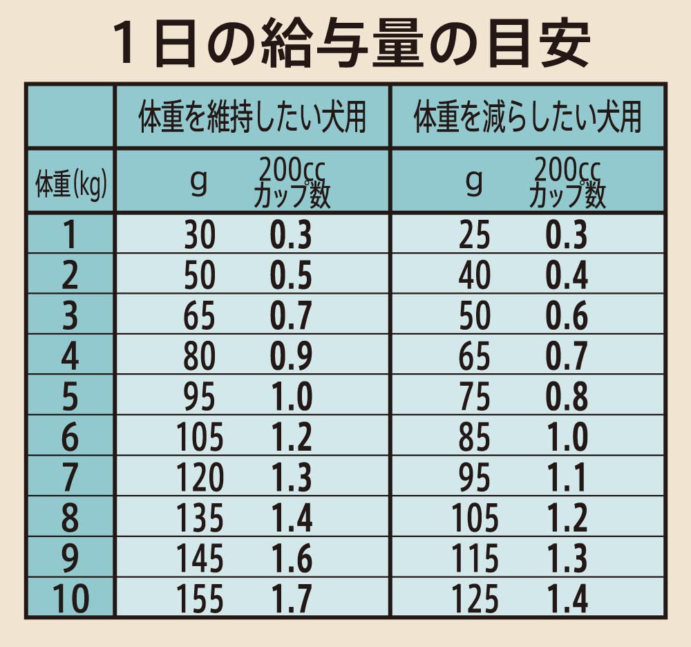 1日の食事量の目安 ●体重を維持したい犬用 体重1kg:30g(200ccカップ0.3)、2kg:50g(200ccカップ0.5)、3kg:65g(200ccカップ0.7)、4kg:80g(200ccカップ0.9)、5kg:95g(200ccカップ1.0)、6kg:105g(200ccカップ1.2)、7kg:120g(200ccカップ1.3)、8kg:135g(200ccカップ1.4)、9kg:145g(200ccカップ1.6)、10kg:155g(200ccカップ1.7) ●体重を減らしたい犬用 体重1kg:25g(200ccカップ0.3)、2kg:40g(200ccカップ0.4)、3kg:50g(200ccカップ0.6)、4kg:65g(200ccカップ0.7)、5kg:75g(200ccカップ0.8)、6kg:85g(200ccカップ1.0)、7kg:95g(200ccカップ1.1)、8kg:105g(200ccカップ1.2)、9kg:115g(200ccカップ1.3)、10kg:125g(200ccカップ1.4)