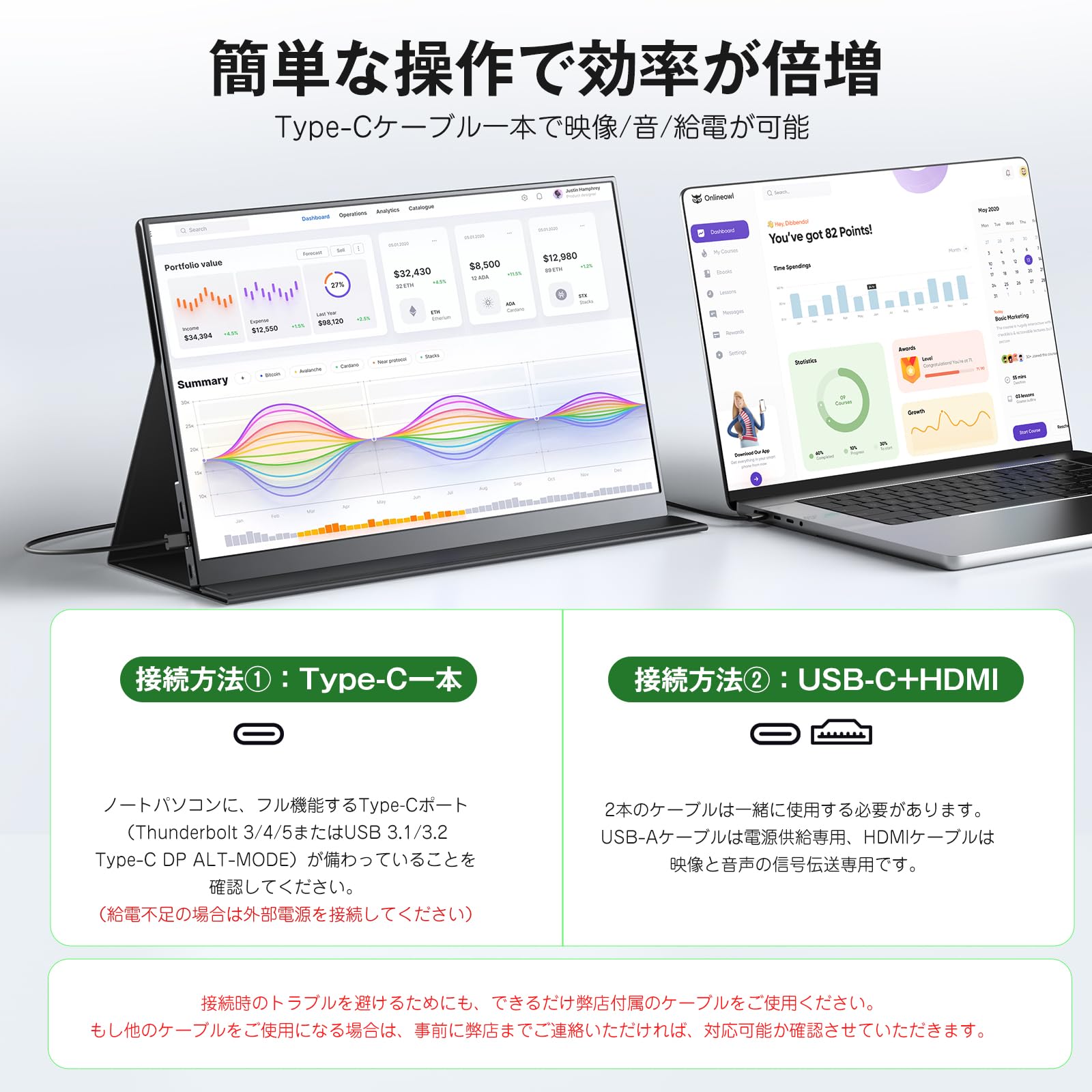 【ケーブル1本で画面信号と給電可能】USB Type-Cケーブル1本で画面信号と給電が可能です。USB Type-Cディスプレイ給電に対応しており、電源コンセントが不要なので、どこでも利用できます。さらに、Mini HDMI端子も搭載されており、スクリーン拡張や映像出力にも対応しています。専用ドライバーも不要で、購入後すぐに使用できます。注意:デバイスに接続するには、Type-C3.1又はThunderbolt3/4のフル機能のポートをサポートするのが必須です。給電不足の場合は5v/3Aの外部電源を接続してください。電源アダプターは付属されません。