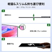 【薄型・軽量・持ち運び便利】ポータブルモニターは重量570g、最薄部5mmというスリムデザインで、旅行バッグにも簡単に収納できます。折りたたみ式の保護ケースが付属しており、外出先でも安心して使用できます。プレゼンや資料閲覧に最適です。