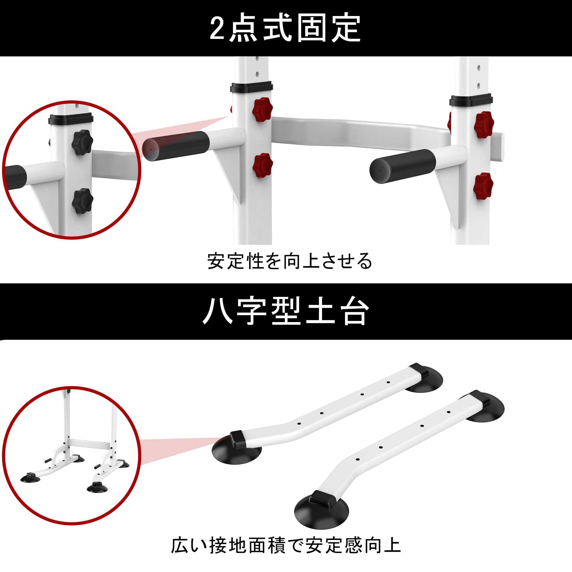 【安心・頑丈な設計】八字型土台フレームと2点式固定支柱により、安定性が抜群です。室内使用を考慮した滑り止めゴム足が、床の保護と室内騒音防止に役立ちます。