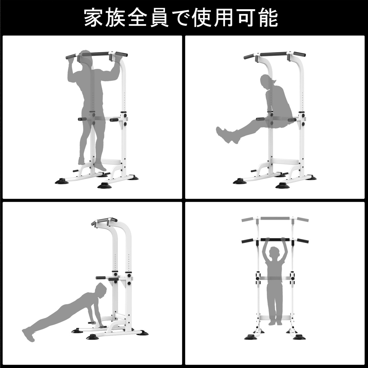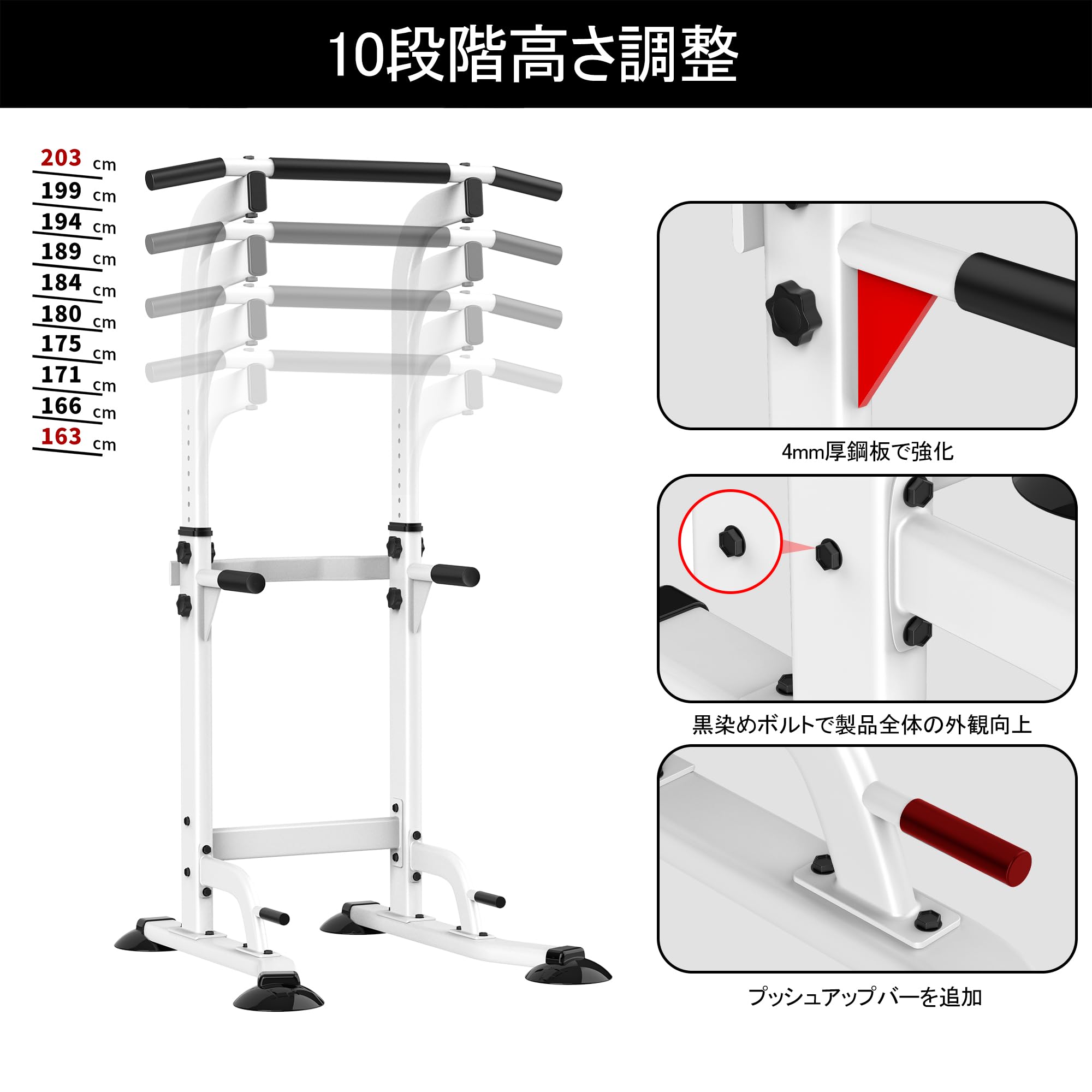 本製品には2年間の無料保証サービスが付いており、日本国内の会社が直接運営しています。商品到着後に破損などの問題が発生した場合は、迅速に対応いたしますので、安心してお買い求めください。取扱説明書と工具が付属しており、女性でも簡単に組み立てることができます。組み立て時間は約30分です。本製品は高品質で堅牢かつ軽量なスチールを使用しており、優れた耐久性を持ち、簡単に移動できます。八字型の底座フレームと二点式固定支柱により、卓越した安定性を提供し、滑り止めゴム足が室内の床を保護し、騒音を防ぎます。本製品は高さ調節が可能で、幅広い年齢層の方々にご利用いただけます。また、黒染めボルト加工を採用しており、耐久性を向上させるとともに、製品の美観も高めています。本製品は、懸垂、自重トレーニング、腕立て伏せ、ディップス、膝上げ、斜め懸垂、背筋、腹筋、胸筋など、多種多様な筋肉トレーニングに対応しています。引体向上機本体の重量は約13.5kgで、移動が簡単です。サイズは幅約73cm x 奥行約80cm x 高さ約163cm-203cm(高さは10段階調節可能)で、最大耐荷重は150kgです。