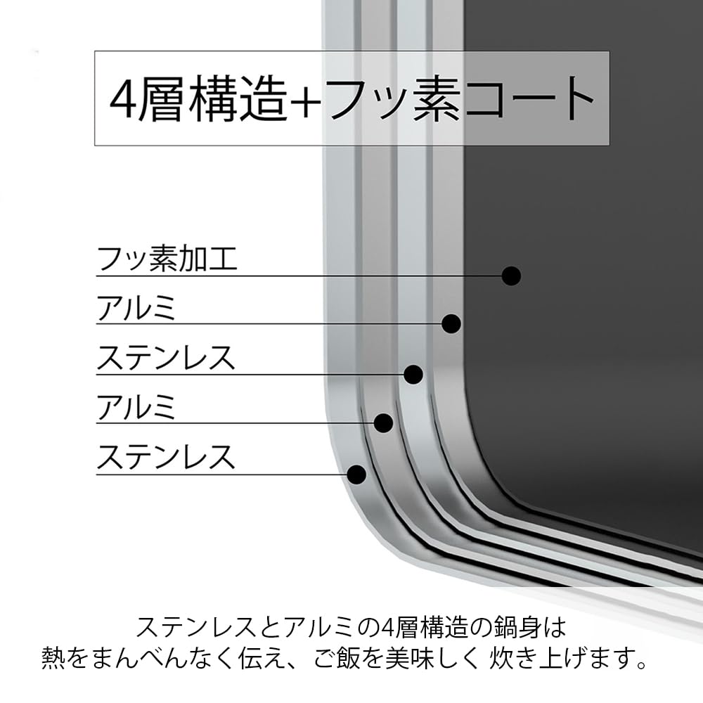 ステンレスとアルミの4層構造の鍋身は熱をまんべんなく伝え、ご飯を美味しく炊き上げます。 内面にはフッ素コートを施してあるので、ご飯がこびりつきにくくなっています。 ご飯以外に煮込み料理にもお使いいただけます。