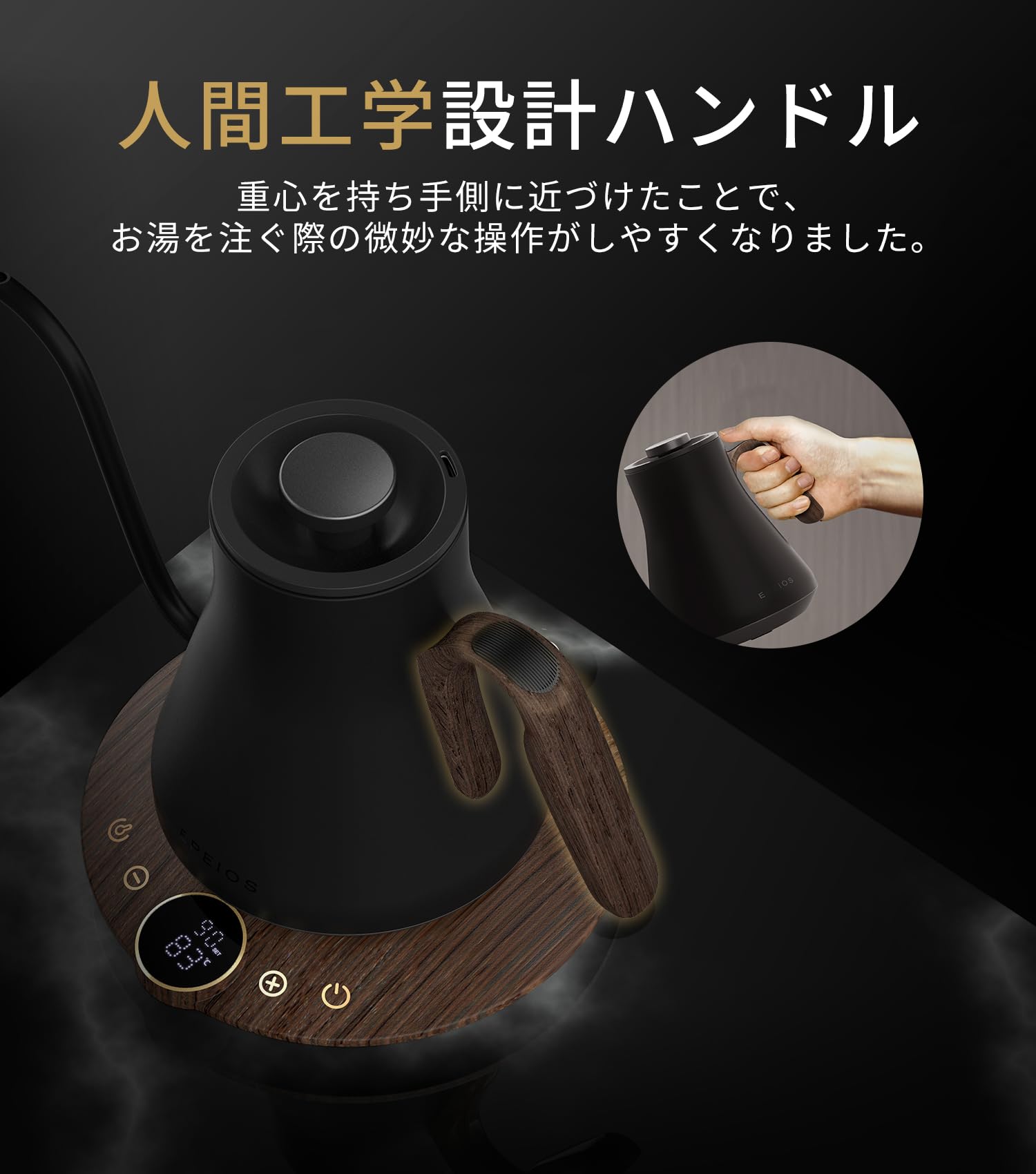 【人間工学設計ハンドル】人間工学に基づいたハンドル設計を採用しています。お湯を注ぐ際、手首や腕にかかる負荷を軽減し、繊細な操作を行うことができます。熱くならず、持ちやすいハンドルで、持つだけで自然と注ぐ角度になるように設計したことで、初心者でも操作しやすくケトルになりました。