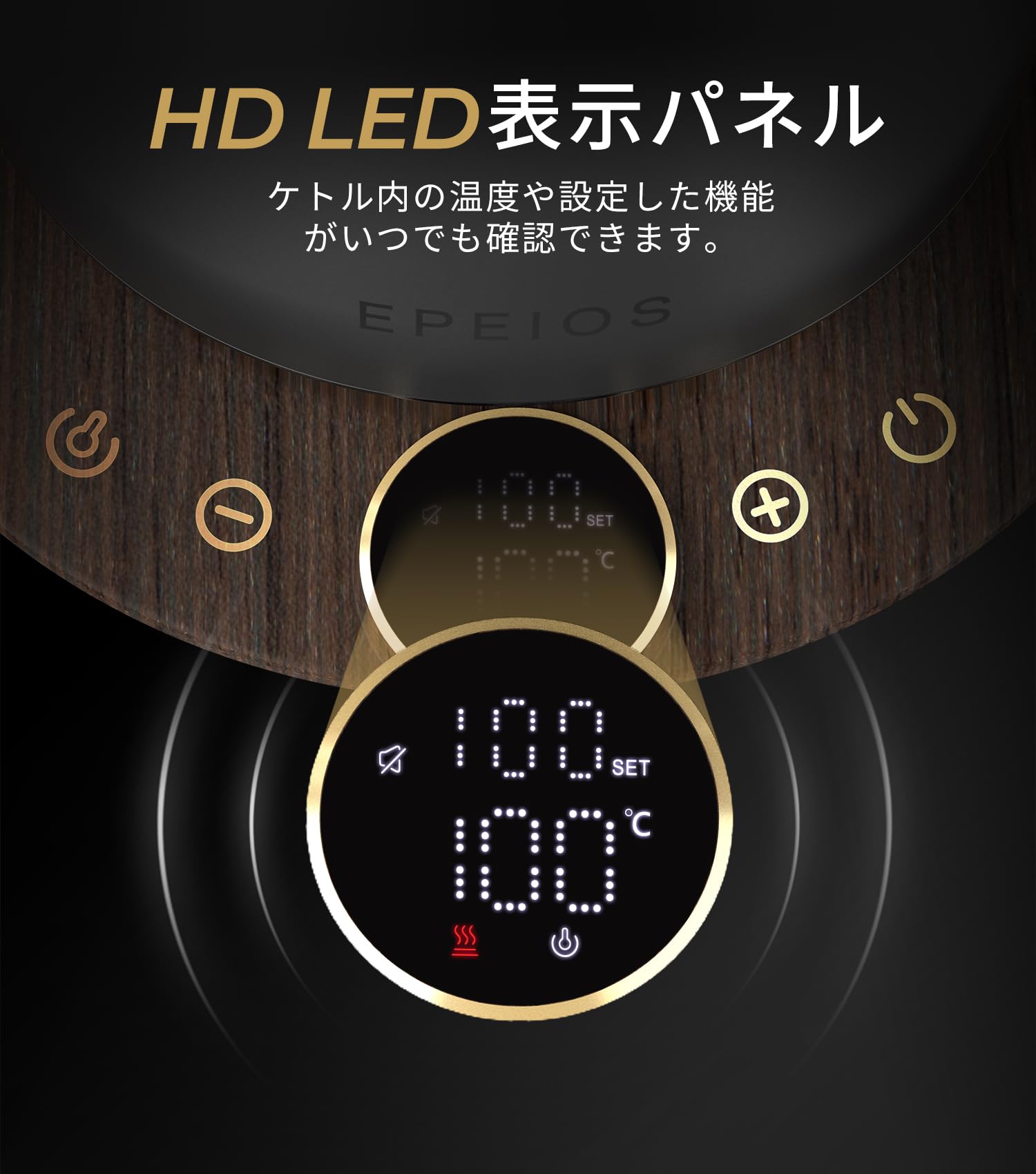 【HD LED表示パネル】エペイオス電気ケトルは、HD LED表示パネルを搭載しています。ケトル内の温度や設定した機能をいつでも簡単に確認することができます。操作が直感的で、使いやすさを追求した設計となっています。