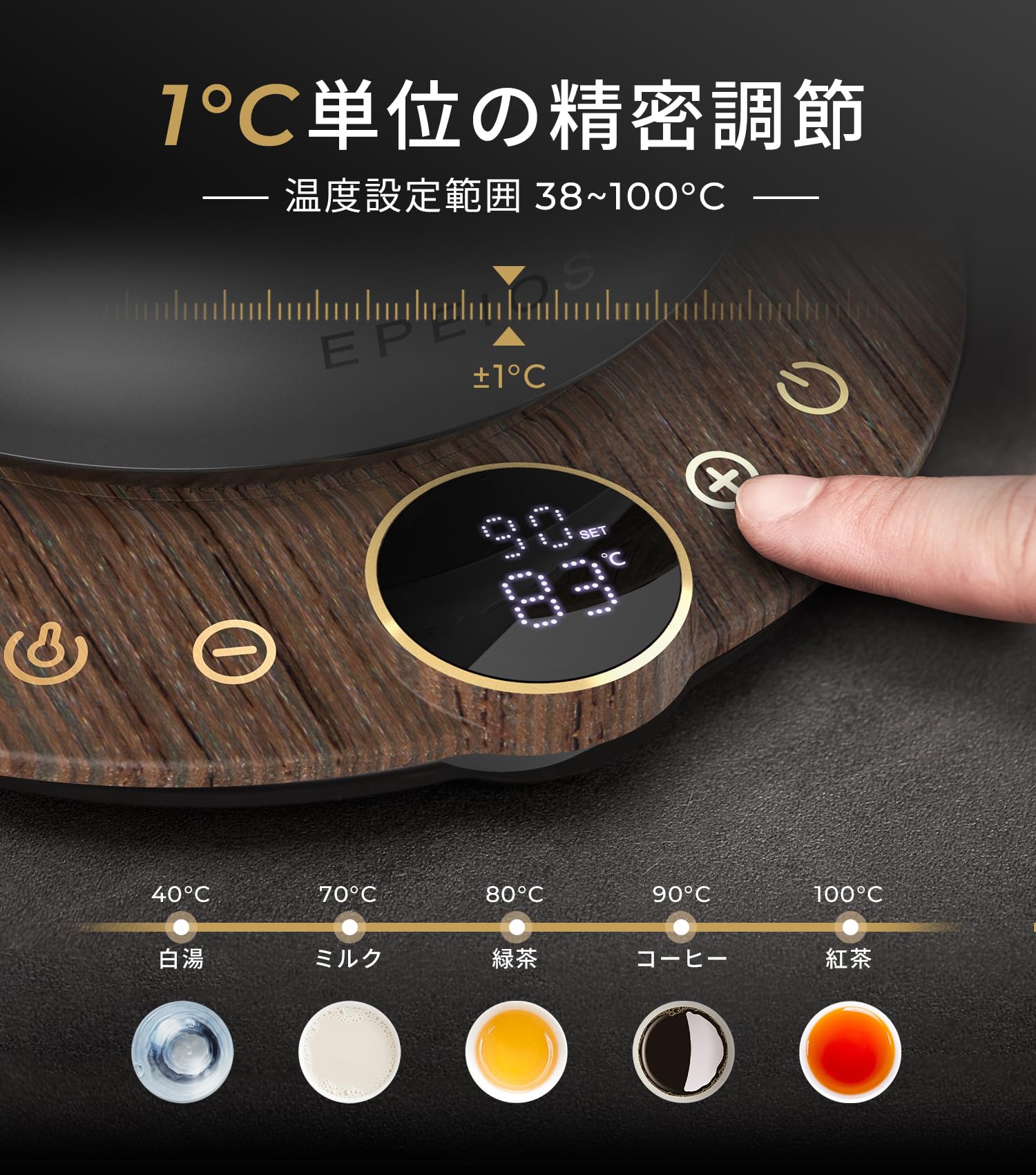 【1°C単位の精密調節】エペイオスのコーヒーケトルは、細部に宿る美味しさを追求、1℃の調整で究極の一杯を実現します。このケトルは1°C単位の精密調節で、38~100℃までの範囲で設定できます。細かく挽いたコーヒー豆と、時間や温度を精密に調整したお湯を組み合わせて抽出することで、最高品質のコーヒーを提供します。