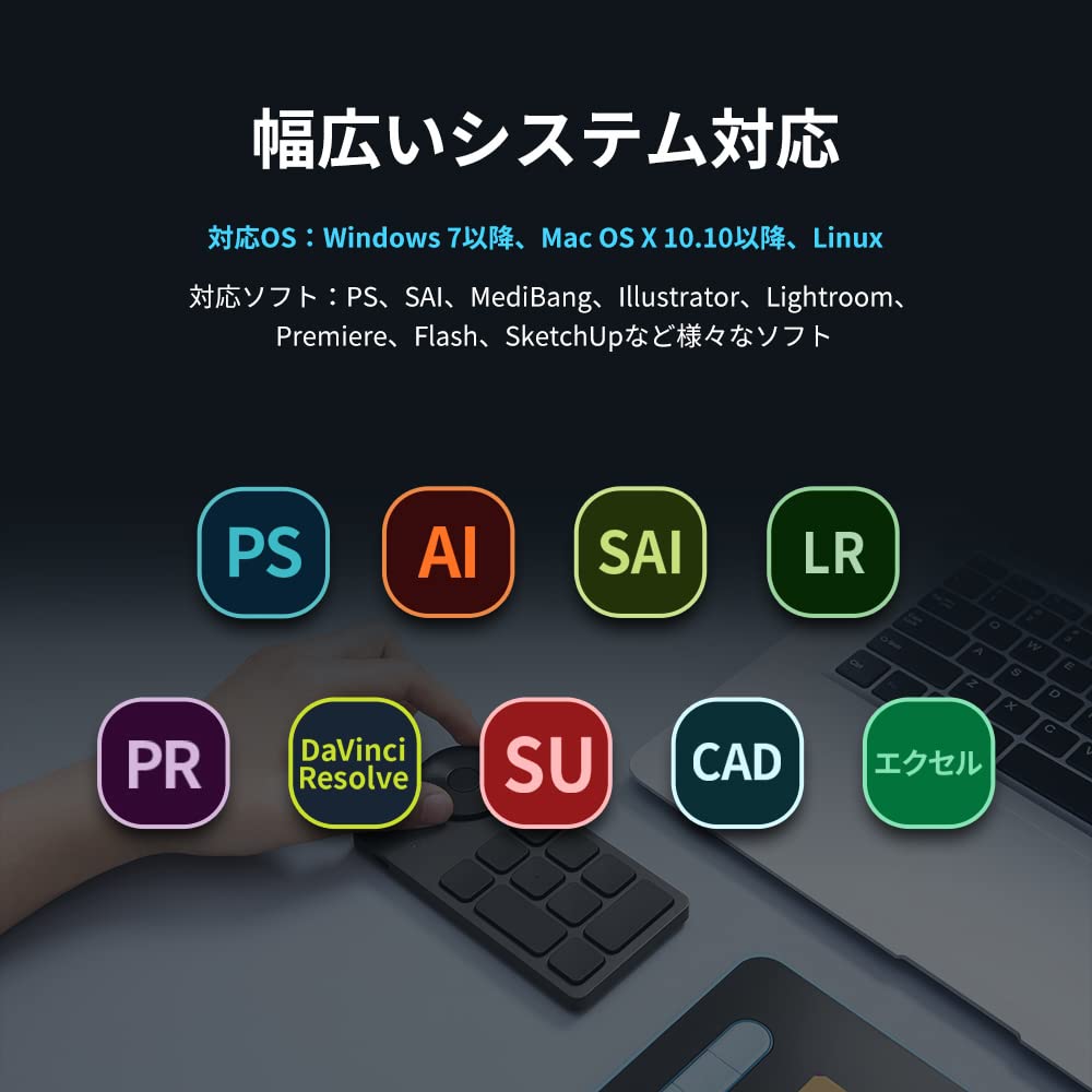 【複数デバイス間でも使用簡単】ドライバの設定内容をACK05本体に保存することで、複数デバイス間における設定共有が容易になり、繰り返し設定を行う必要がなく、創作がより便利になります。※有線接続のみ対応。※同じOSのみ対応。例えば、Windows版ドライバからエクスポートした場合、Windowsのみにインポート可能【高い互換性】対応OS:Windows 7以降、macOS 10.10以降、Linux。【接続方式】①Bluetoothでパソコンと接続。②付属USBレシーバーでパソコンと接続。③付属ケーブルでパソコンと接続。※Bluetooth接続は、すべてのBluetoothアダプターに対応することを保証するものではありません。