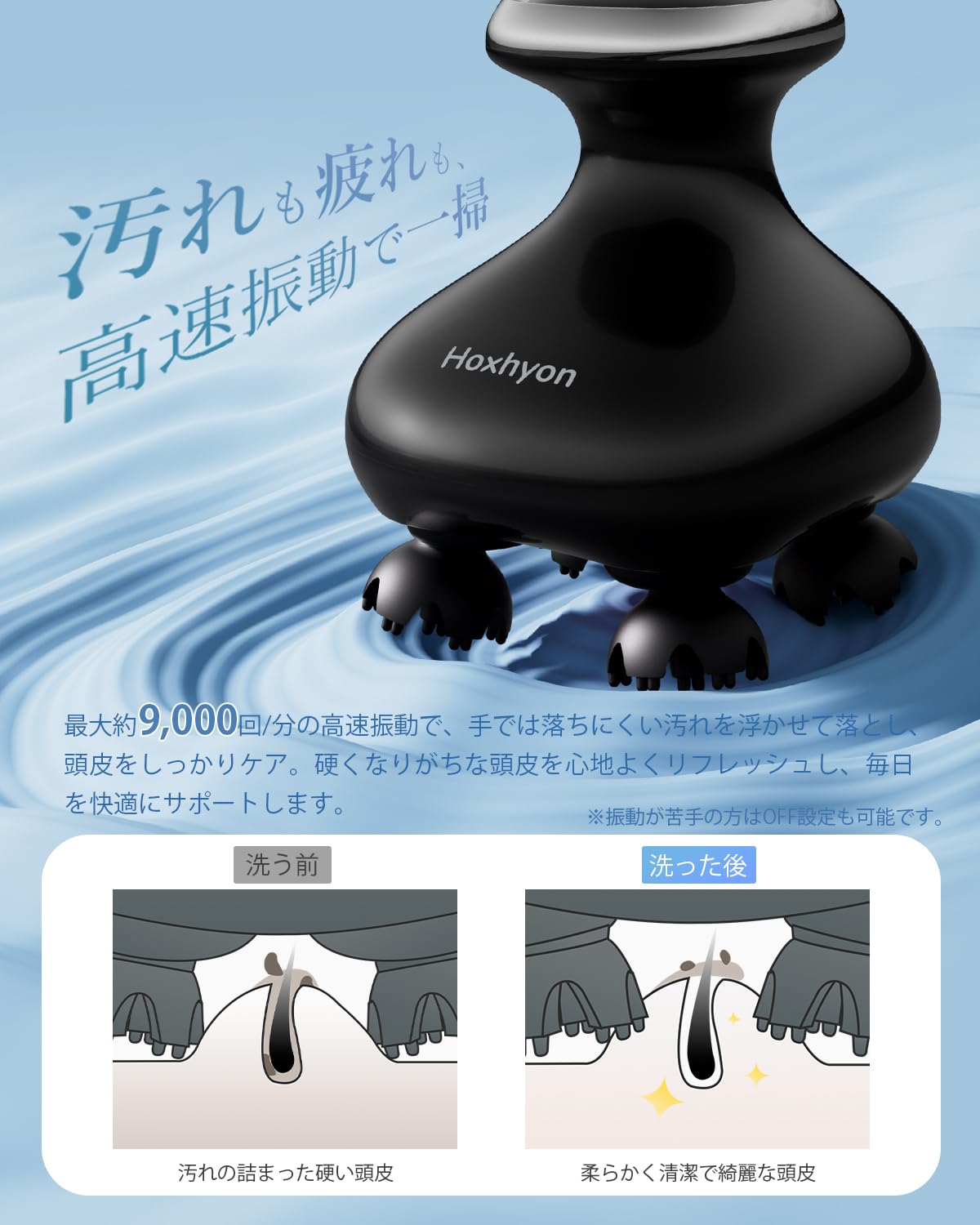 【高速振動でスッキリ!汚れも疲れも】持続振動と断続振動の2つのモードを搭載したアップグレードされた振動機能により、手では落としにくい汚れを浮かせ、心地よく振動で取り除きます。最大約9,000回/分の高速振動で、シャンプー時に使用することで、毛穴の奥の汚れもスッキリとケア。柔らかな地肌へと導き、毎日のケアをより快適で簡単に楽しめるようサポートします。※振動が苦手の方はOFF設定も可能です。