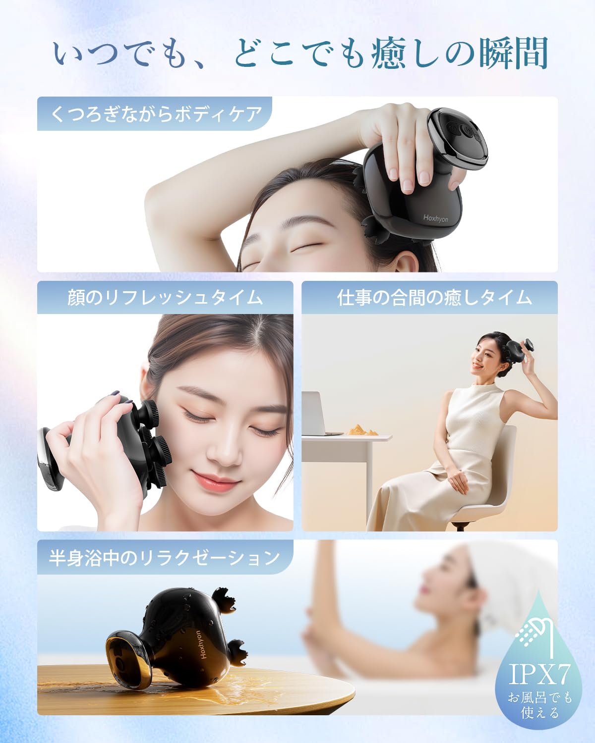 【プロのような揉み心地をご自宅で】柔軟性と硬さのバランスが絶妙な高品質シリコンを採用し、まるでプロの手で優しく揉まれているような心地よさを実現。4つのモードと6種類の動きで、まるでプロの手技を体感しているかのように、贅沢なリラックスタイムをお届けします。頭皮ケアやリフレッシュをしたいとき、サロンに行かずとも自宅で気軽に楽しめる、毎日頑張るあなたへのご褒美ケアです。